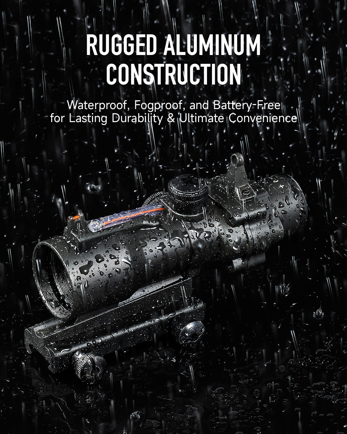 Discover precision and speed with Pinty's 4x32 prism scope with fiber sight. The combination of the prism scope and fiber sight ensures completely battery free operation and allows for quick target acquisition, making it particularly effective in dynamic and fast paced shooting scenarios. The integrated fiber optic automatically adjusts brightness based on available light conditions. With 4x magnification and 32mm multicoated green lenses providing 95% light transmittance, this tactical rifle scope delivers sharp, bright images for enhanced accuracy. The backup iron sights ensure rapid target acquisition with minimal parallax, and convenient thumb screws allow for effortless attachment to 20mm Picatinny rails—no additional tools required. Unleash precision with Pinty's fiber optical scope for an unparalleled shooting experience.