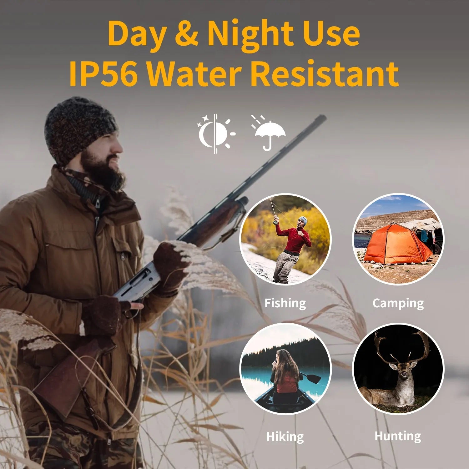 - BATTERY LIFE – Up to 6 hours of continuous video recording time, as well as 17 hours of constant operation without infrared lights in the daytime (using 6x AA batteries – not included), allows for long-lasting use in any weather condition. IP56 Water resistance