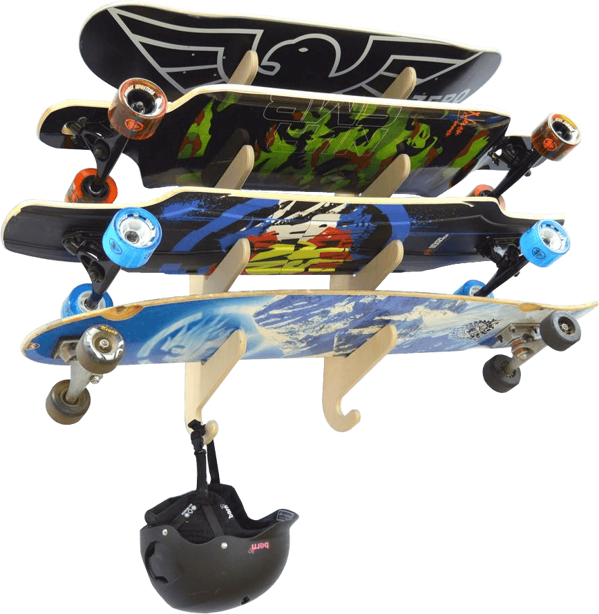 This skateboard and longboard wall rack has a really cool feature – its unique wall mounting system. Each rack arm is actually “hooked” into a cross support bar and allows it to independently move around. What this means for you is that mounting the rack is super easy and forgiving. For instance, say you mounted a skateboard rack permanently on the wall, then went to put your boards in place but then found that you mounted the arms too close together. With a normal rack, you would have to undo all the work you did and live with the old holes in your wall. With this rack's mounting system, you can simply move the arms apart to your desired distance!