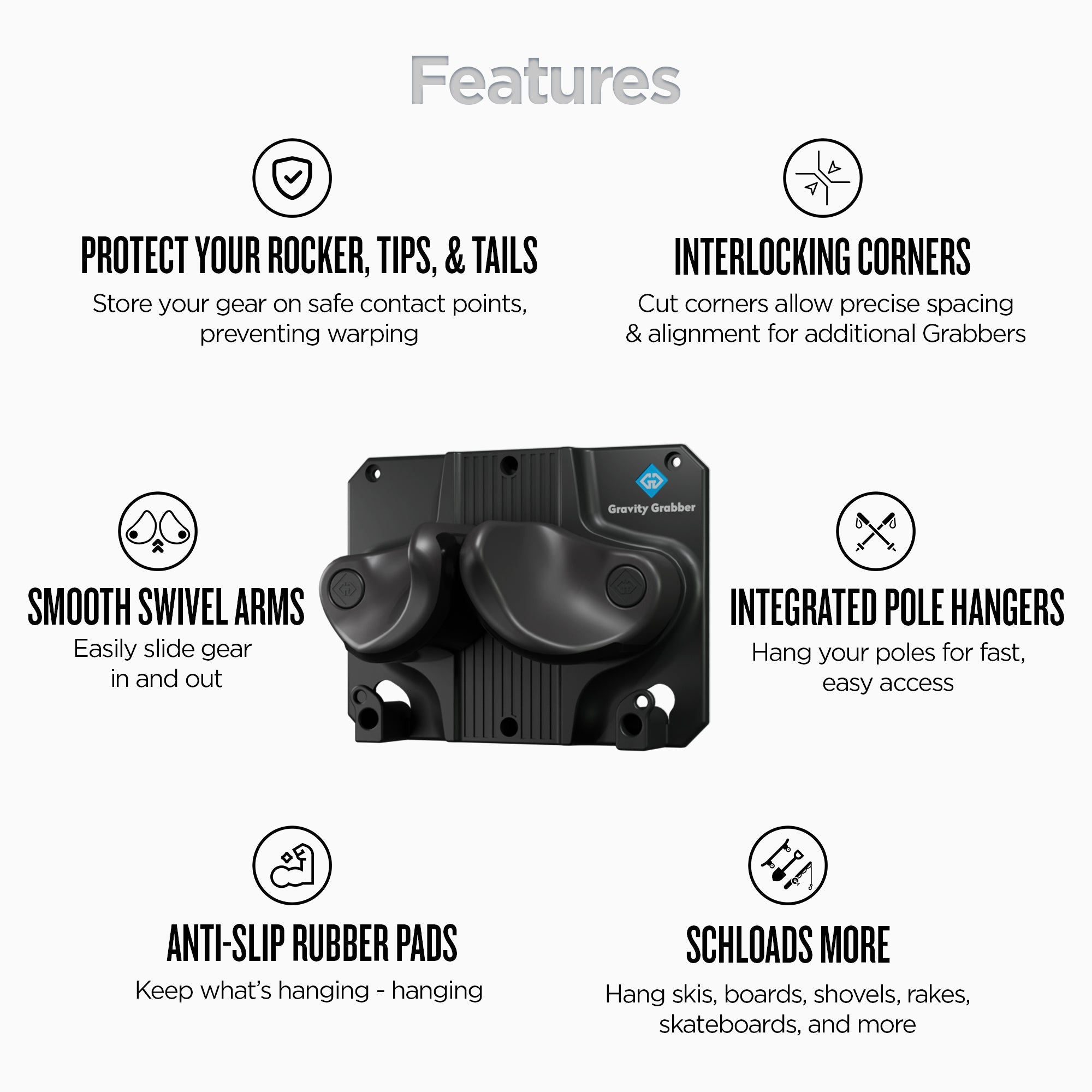 While storing your skis and snowboards is very important, we know storing other gear is too. From skateboards to shovels and rakes, Gravity Grabber will hold other things, too, making it the ultimate year-round storage system.