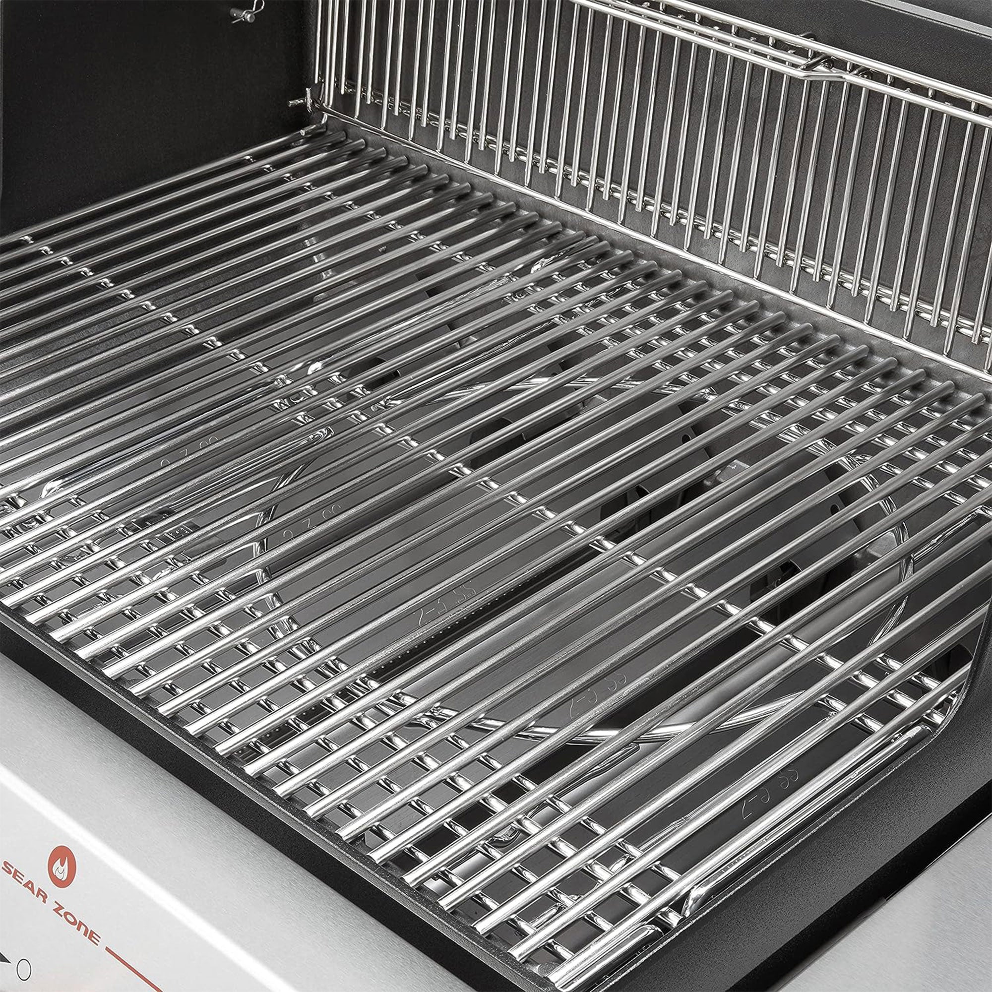 Experience a journey of flavors as you prep, sear, and serve. These grates provide unparalleled performance with even heat distribution and superior retention, ensuring a flawlessly seared finish for every dish. With an expansive sear zone and an expandable top cooking grate, every element of your feast finds its place on the grill. Meats sear beautifully, vegetables get charred elegantly, and sides acquire irresistible smokiness all on the same grill, all at once. This grill enhances your outdoor experience with an extra-large prep-and-serve side table, making the transition from grill to plate seamless. The Weber grill's high-performance burners ensure precision cooking, and the stainless steel bars add a symphony of flavors, while the pull-out grease tray keeps things clean.