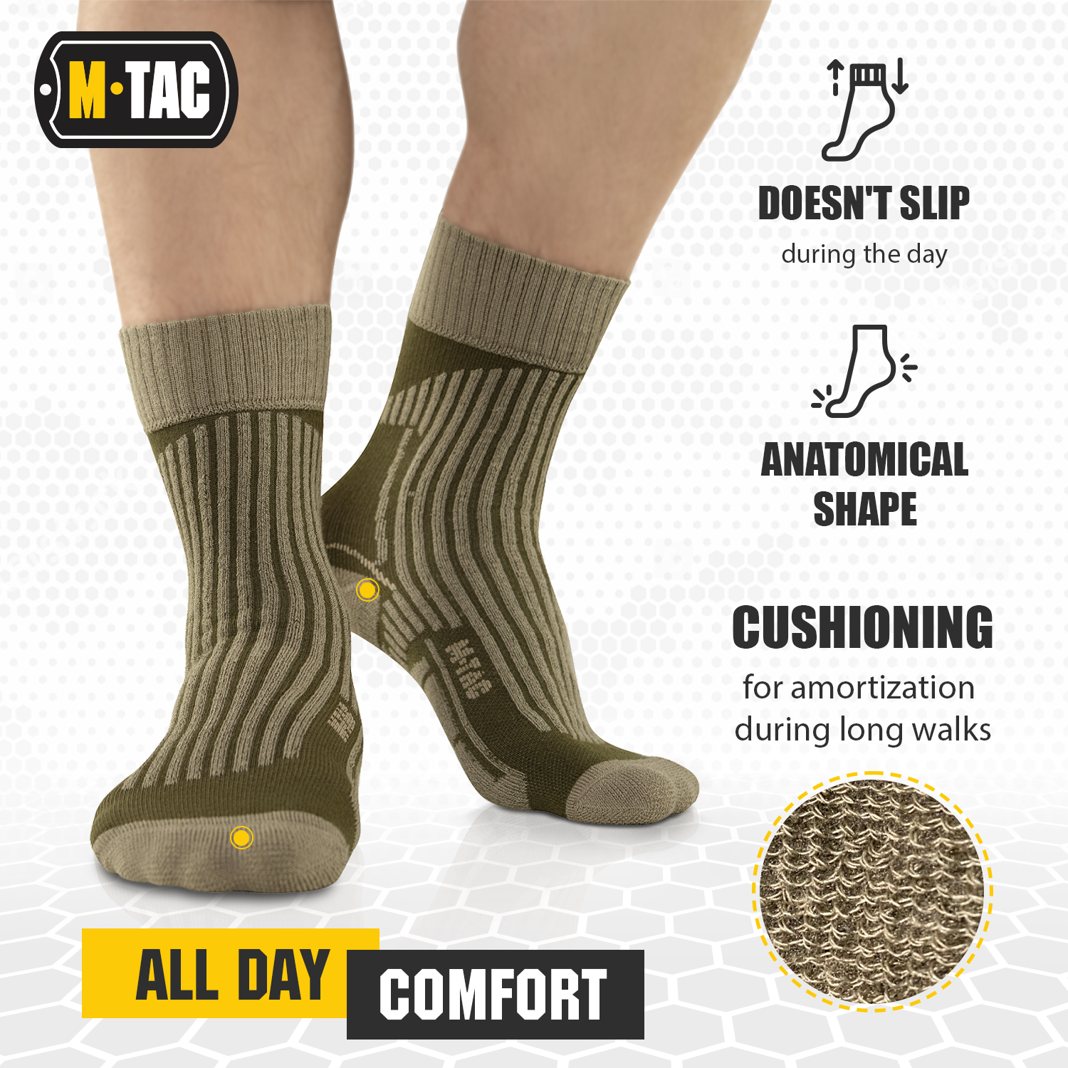 The Crew Coolmax 75% socks from the M-Tac brand are one of the most popular products for men. Sewn from innovative technological material ( 75% Coolmax, 17% nylon, 8% elastane). It is pleasant to the touch, elastic and provides excellent thermoregulation, as a result of which the socks have perfect moisture wicking. The dense rubber band fixes them well on the leg, preventing the socks from twisting or slipping. Anatomical shape ensures comfortable wearing in shoes and prevents chafing. The Crew socks are perfect for everyday use and contribute to maximum comfort when walking or staying in shoes for a long time.
