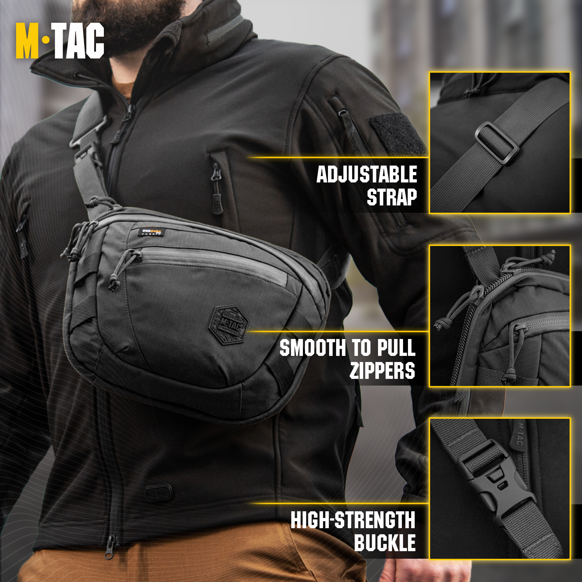 The Sphaera Hardsling Bag Large Elite from M-Tac has a stylish appearance and carefully thought-out functionality. It is made of Cordura 500D, a high-quality material, resistant to abrasion, mechanical damage and high loads. The zippers and buckles are from YKK and Woojin, world leaders in the production of accessories. This model has an adjustable shoulder strap, so the bag can be comfortably carried over the shoulder. The carefully designed compartments can accommodate all your essential items. The bag also includes a compartment for the concealed carry of weapons, while still enabling quick access. In this version, the designers have changed the location of the front pocket and added a stylish hexagon with the company logo. MOLLE straps are provided on both sides of the bag for attaching additional equipment. There is a special phone pocket on the back.