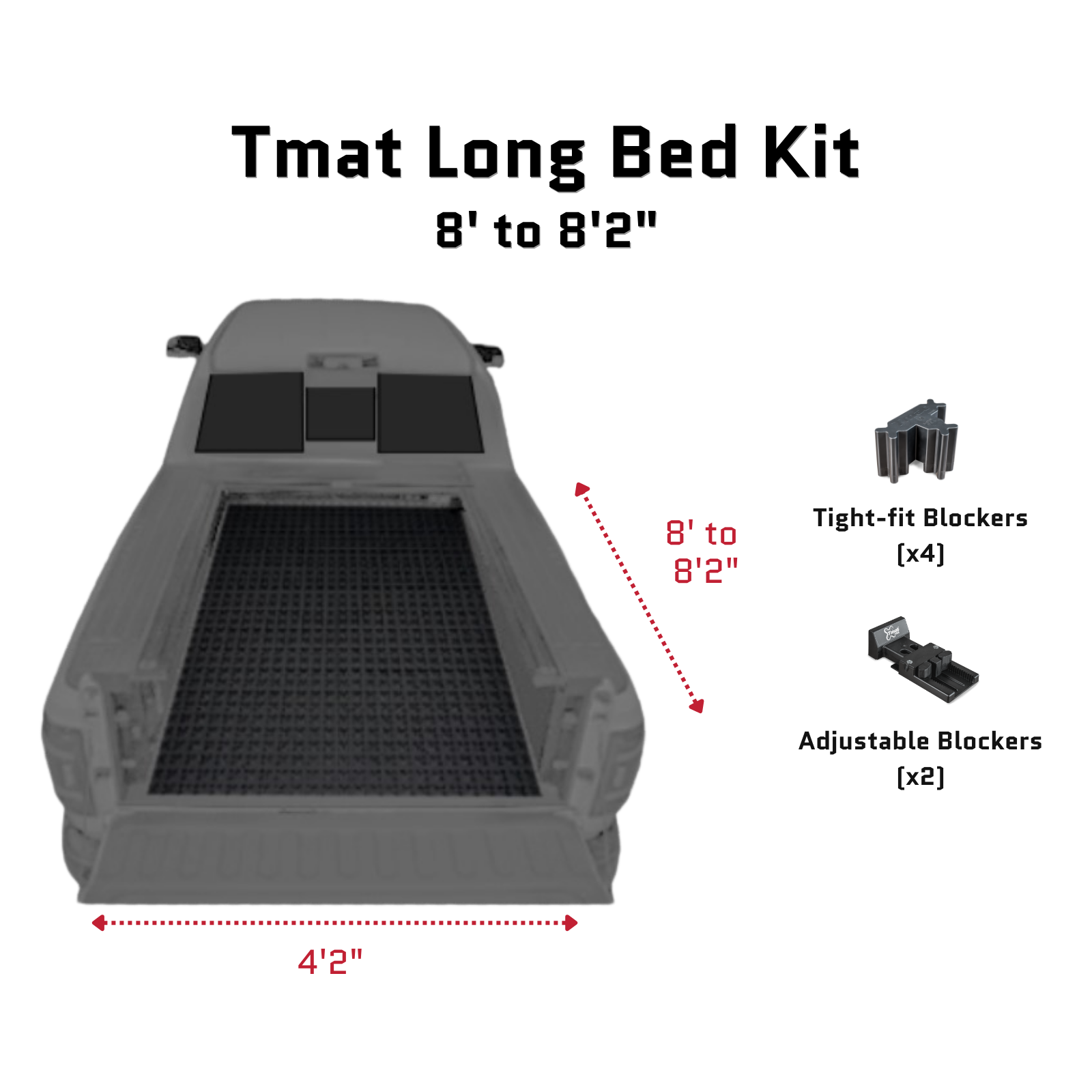 Tmat Management System for 8' to 8'2" long truck bed kit measures 8' long x 4' wide (eight feet by four feet) fully assembled and fits between the wheel wells in most standard size beds between 8' and 8'2" in length. Staying between the wheel wells allows you to easily slide the mat in and out of the bed. This cargo management system can easily be modified to your own specifications. The blockers simply plug into the mat in any configuration to hold your tools and equipment in place.