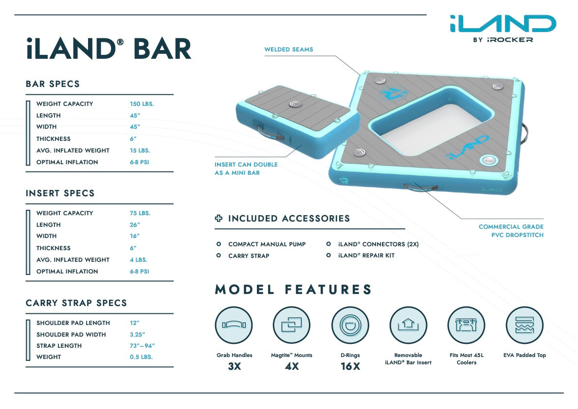 The iLAND® Bar includes an insert that nests inside for a flat surface or floats alongside as a speaker or drink holder. It’s versatile, lightweight, and adds even more utility to your water setup.