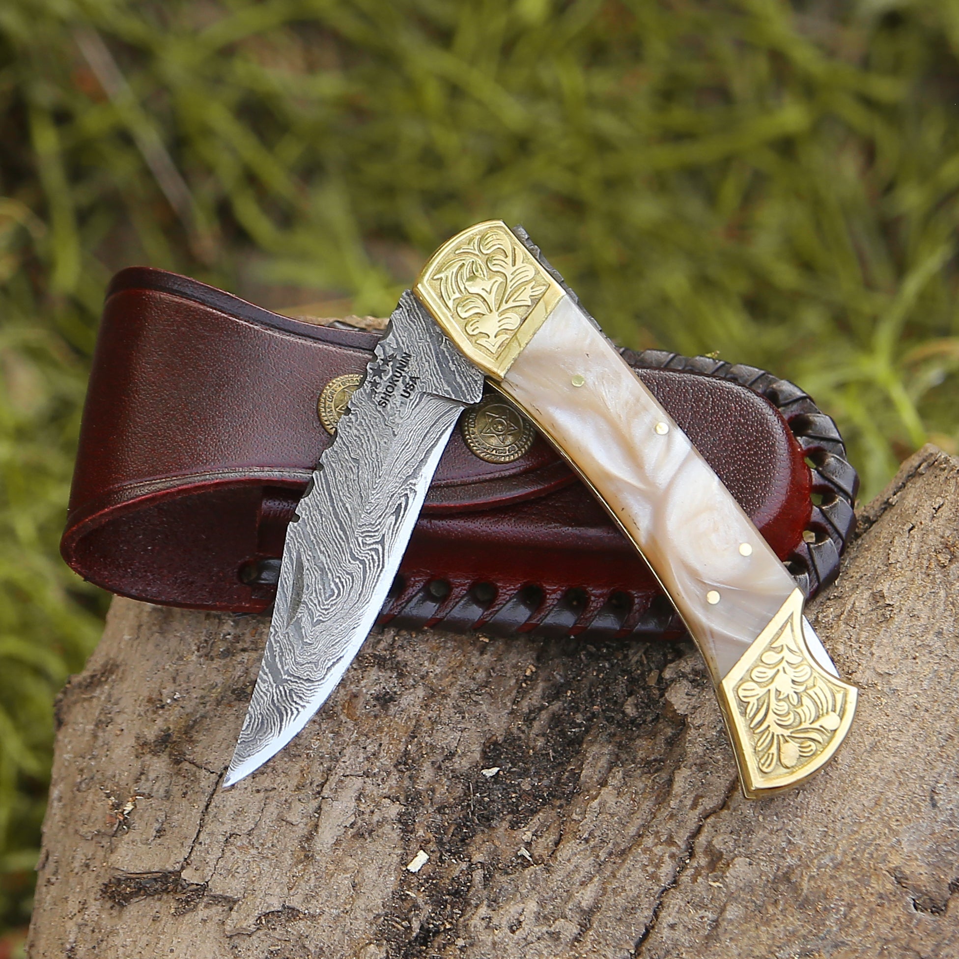 Thunderblade Handmade Custom Damascus pocket Knife with Leather Sheath, Gentleman's Pocket Knife - 8.5" Overall with Mother of Pearl Resin Scales, Back Lock Pocket Knife with Hand Stitched Leather Sheath, Knife Sharpening, Spare Pocket knife Sharpener & Personalized
