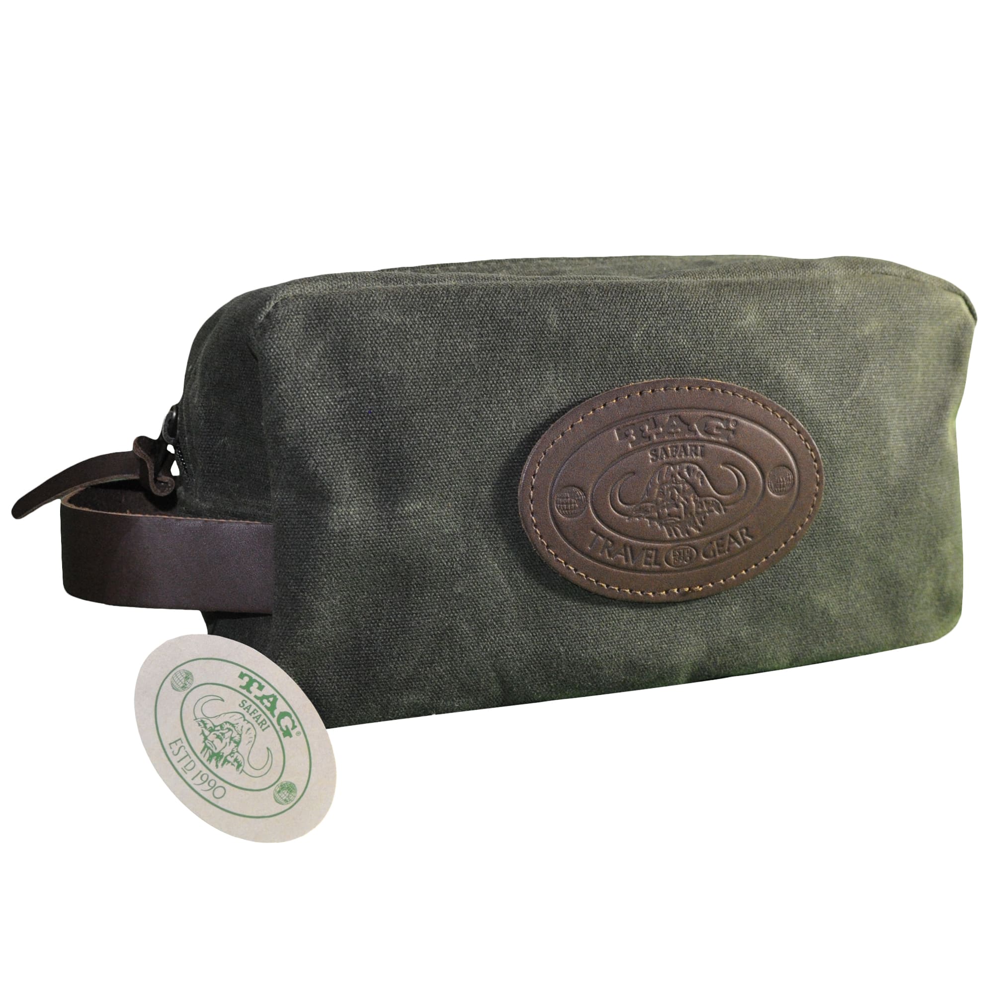 Toiletry Bag, constructed from high grade waxed cotton canvas, makes a perfect companion for the seasoned traveler on a safari in Africa. A zippered wide mouth opening on top offers plenty of room to store soap, shampoo, deodorant, shaving supplies, and miscellaneous sundries. The durable leather handle on the side makes it easy to pick up and go, while its compact size makes it convenient to stash in a corner of your duffel or suitcase. The premium grade waxed canvas makes it naturally water repellent. The Tag logo is neatly embossed on an oval leather patch for an undeniable touch of pride. Made in the U.S.A., this waxed cotton utility bag is the logical way to stay organized on any trip away from home.