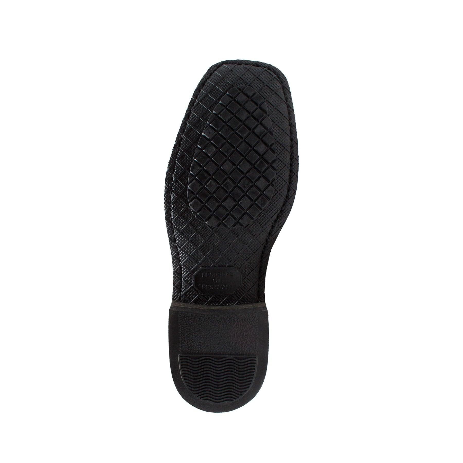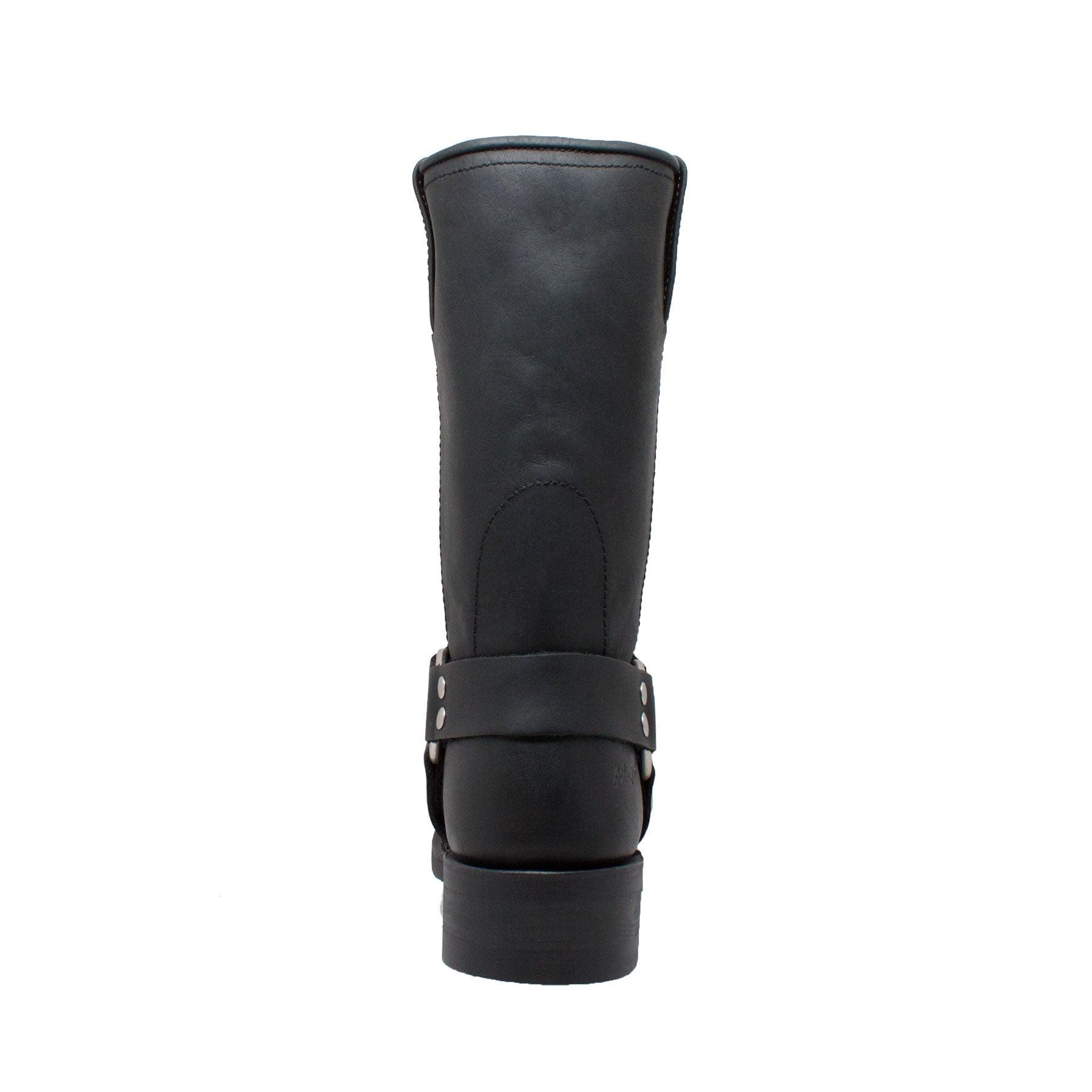 This 12" black heavy duty full grain oiled leather upper harness boot features neophrene oil-resistant sole and heel, a square soft toe, and cushion insole. It also has o-ring ankle harness strap with goodyear construction.