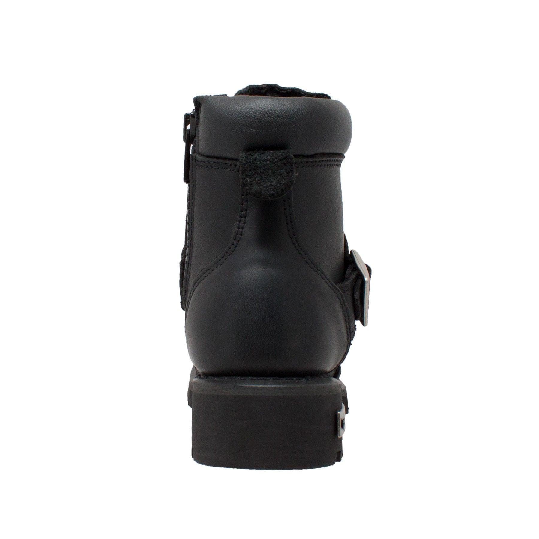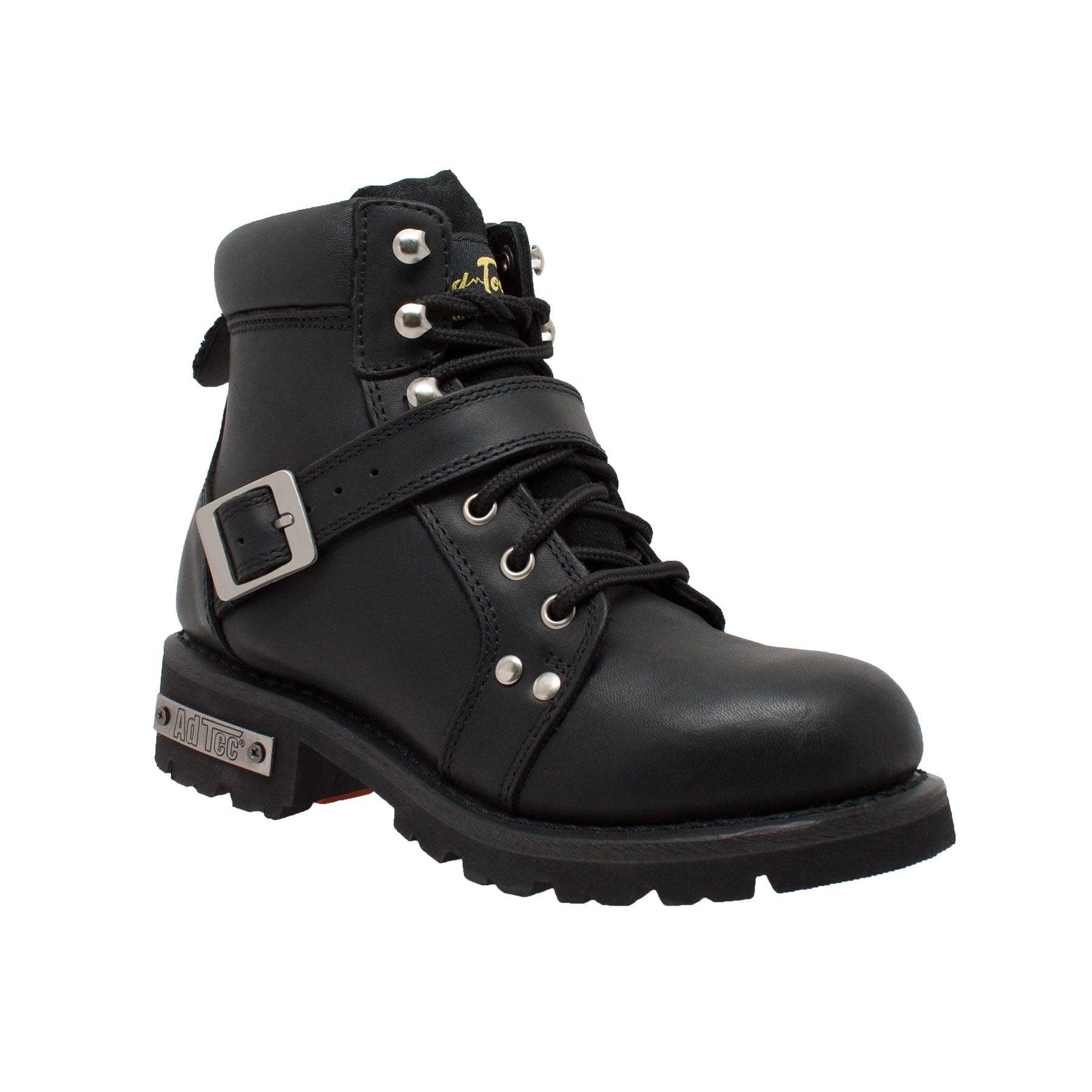 Women's 6 inch black biker boot built for comfort, durability, and traction control. Extra heavy duty traction sole for added protection and style. This boot has Goodyear Welt construction with top quality Full-Grain oiled leather, lace up design with buckle strap, and YKK zipper.