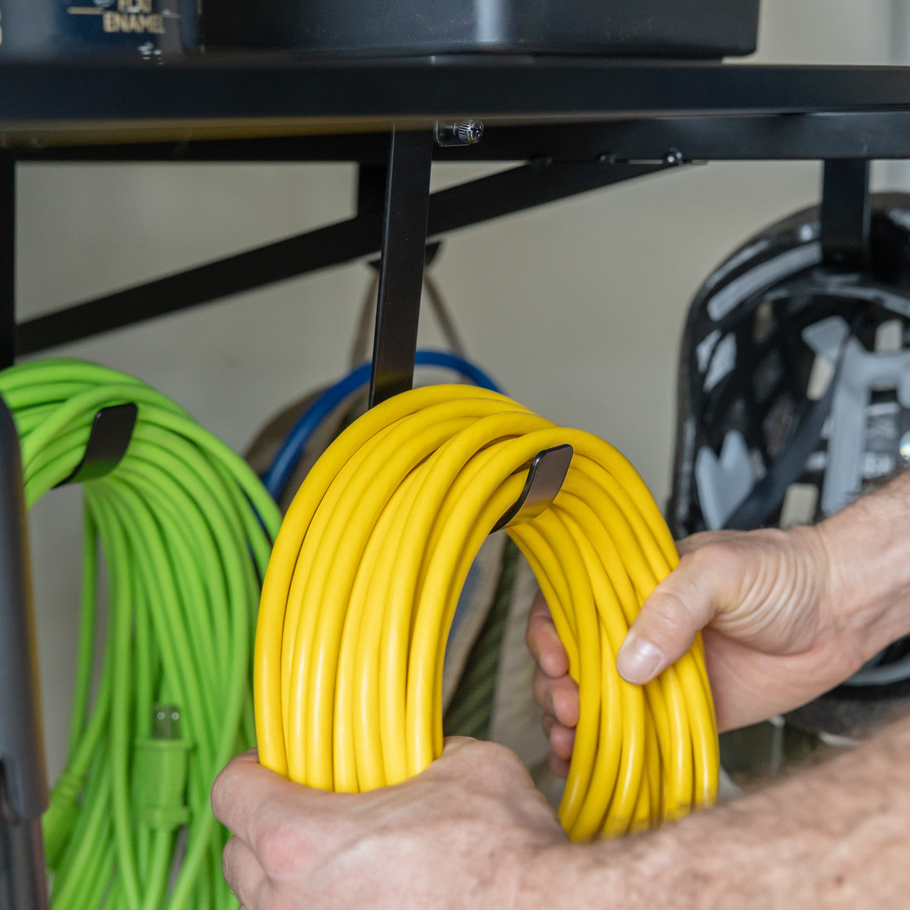 This minimalist, modern-style garage wall shelving is designed to hold all your clutter-causing items and free up floor space. With hooks for extra hanging storage, garage organization is easier and more accessible than ever.