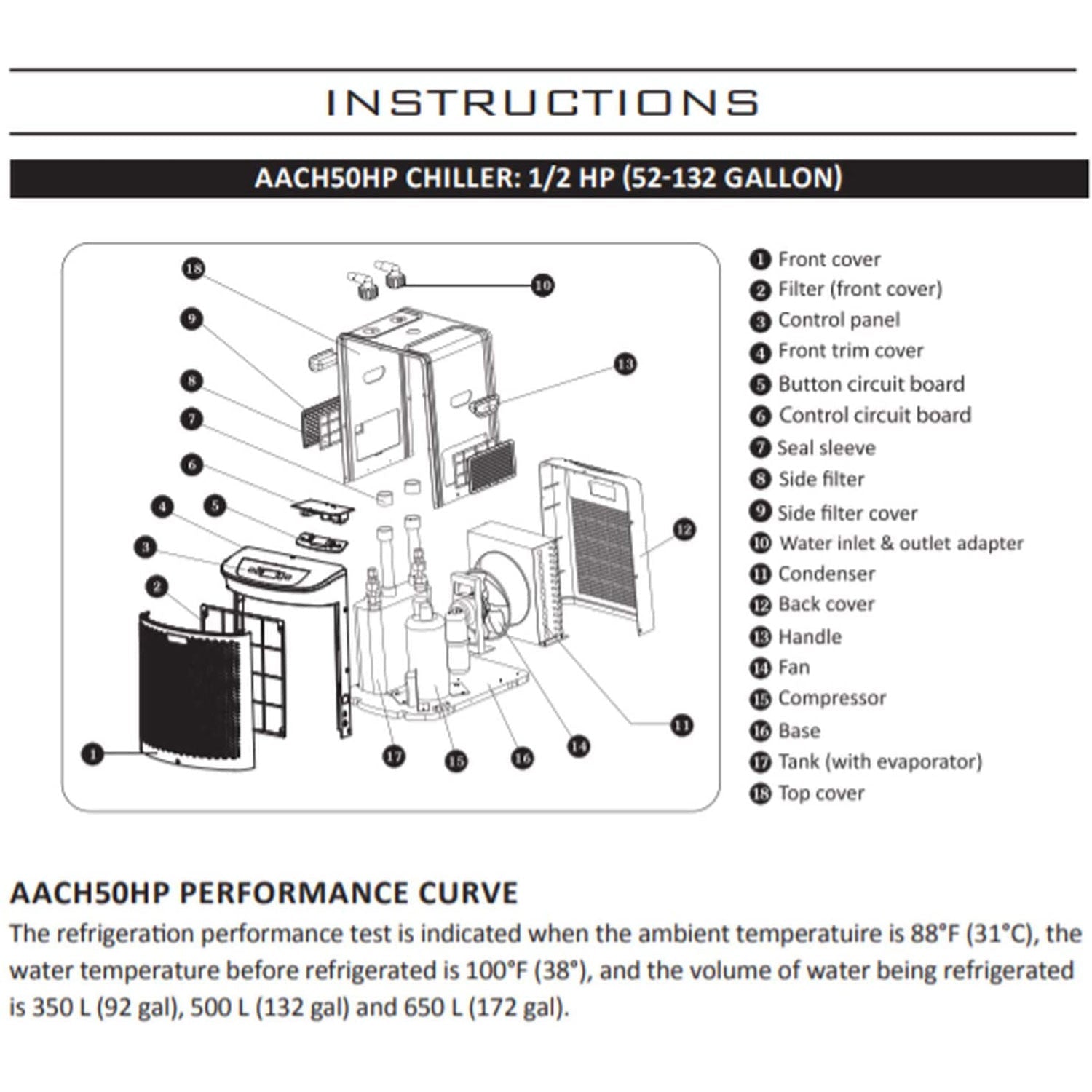 Durability is key with the AACH50HP water chiller for cold plunge baths, featuring an anti-corrosive pure titanium evaporator, suitable for both fresh and saltwater. This cold plunge water chiller includes 0.5-inch and 0.75-inch fittings for easy installation and compatibility with AAPW800, AAPW1000, and AAPC1010 pumps. Rated at 4,020 BTU per hour with 510 watts of power, this cold plunge chiller machine delivers efficient cooling while conserving energy.