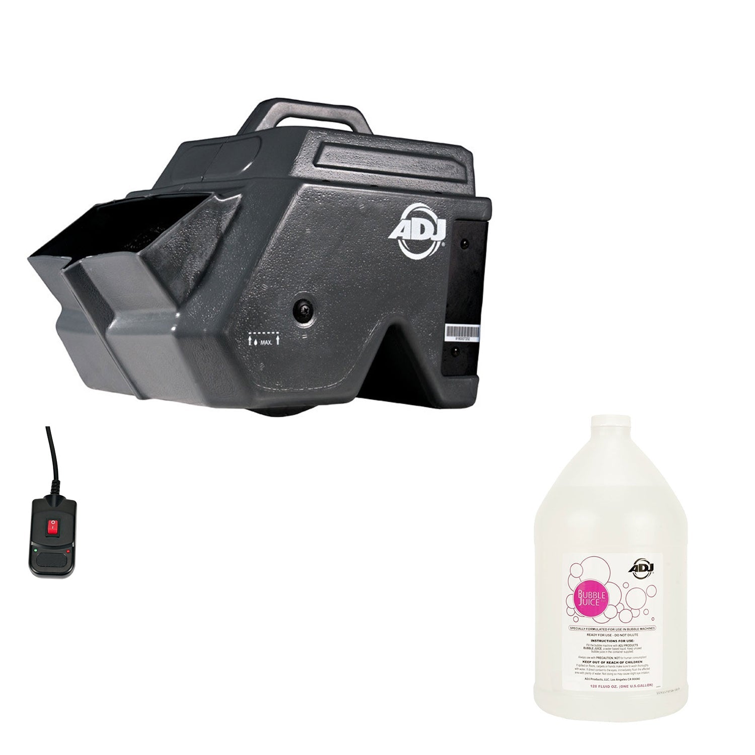 - ADJ Products Bubbletron XL DJ Battery Powered Portable Bubble Machine & Remote bundled with ADJ Products BUB/G 1 Gallon Water Based DJ Bubble Machine Bubble Juice Fluid.
