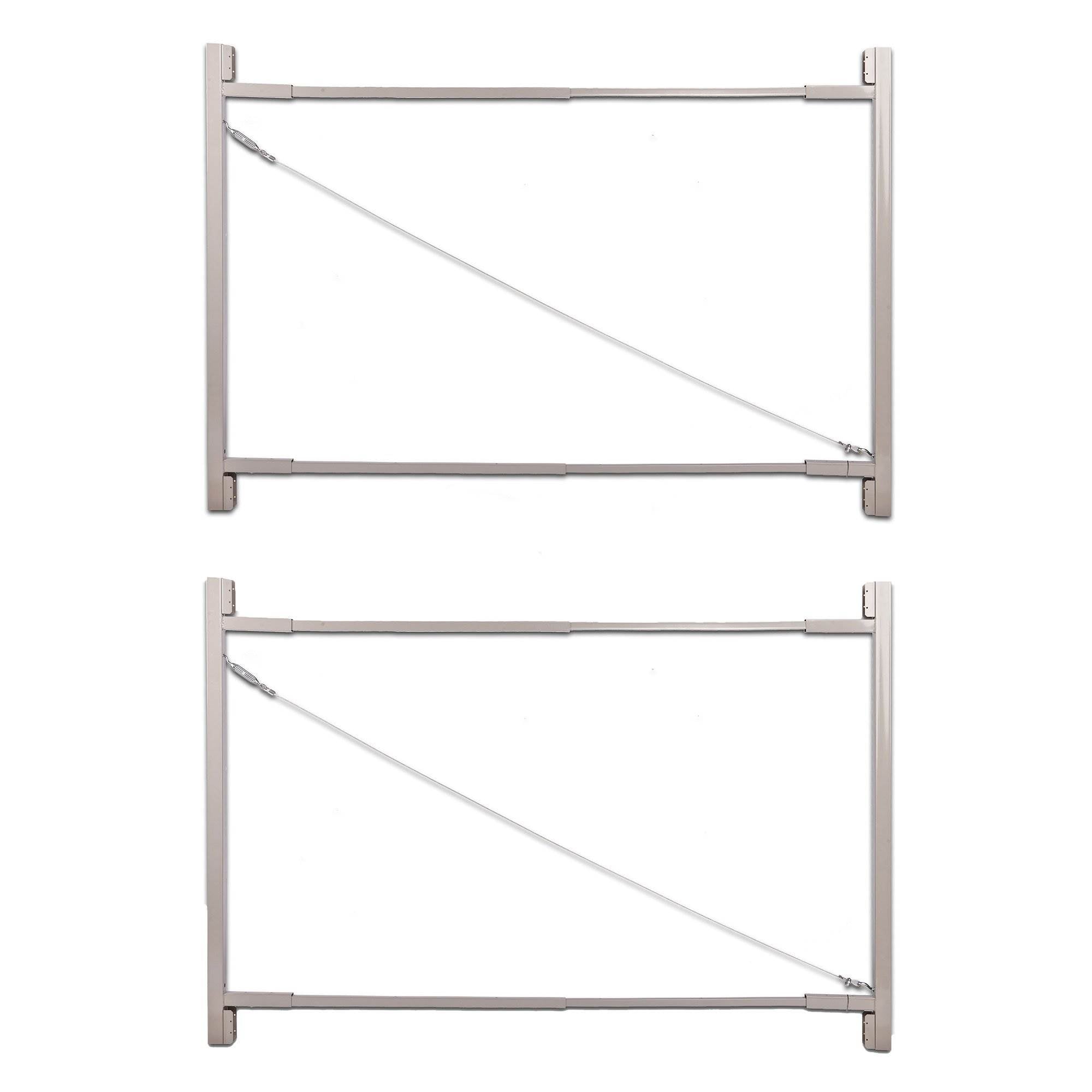 - Package includes: Adjustable steel frame, lockable 2-way gate latch, post and gate hinges, and patented truss cable system