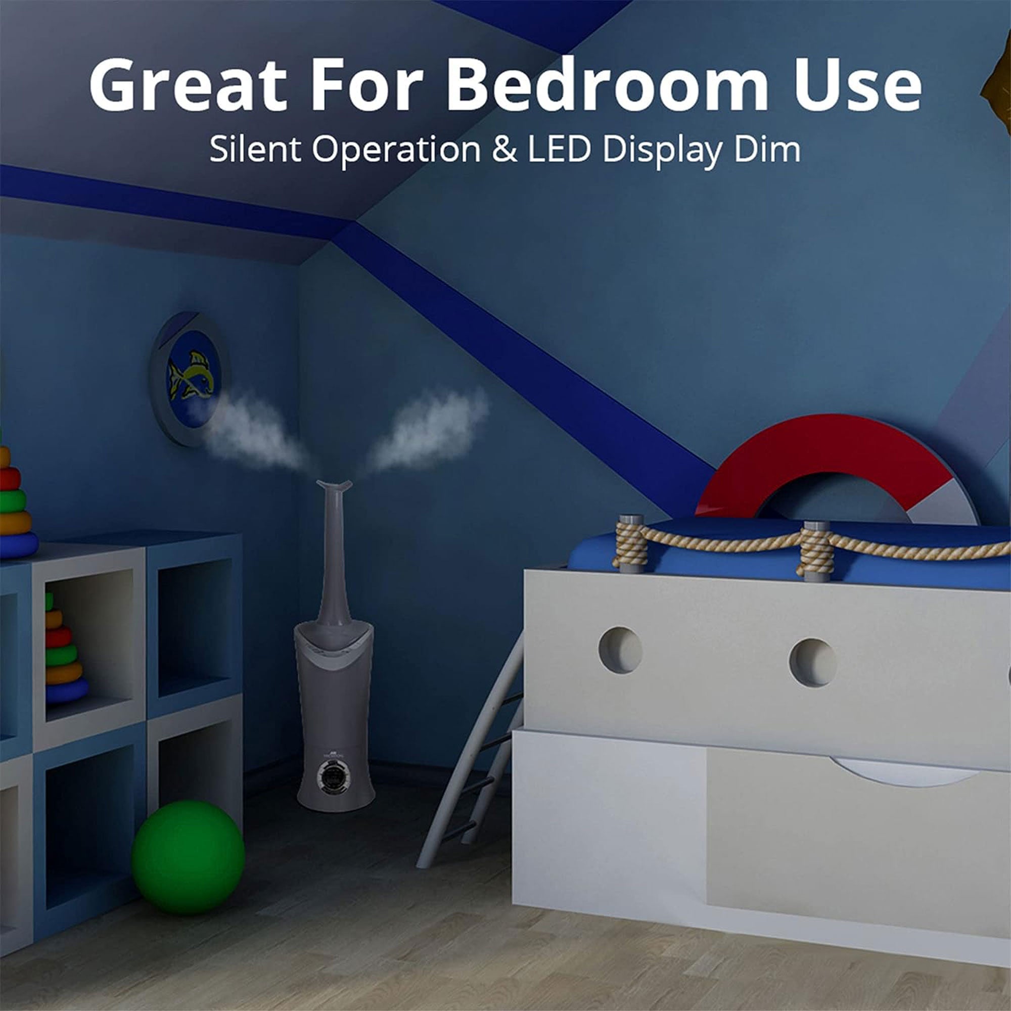The humidifier features a fully programmable timer to turn the unit on and off when you want, top and bottom handles for easy carrying, an extra-wide opening for easy filling, and an auto out-of-water shut off when it runs out of water. This cool-mist humidifier will help kids and babies because the extra humidity will relieve dry eyes, rehydrate skin, help scratchy throats, and will help reduce snoring for better sleeping. Unlike other branded humidifiers, this humidifier model can be used on a tabletop or the floor, thanks to its 15-inch extension nozzle. It also protects and rehydrates furniture, wood cabinets & floors, and furniture.