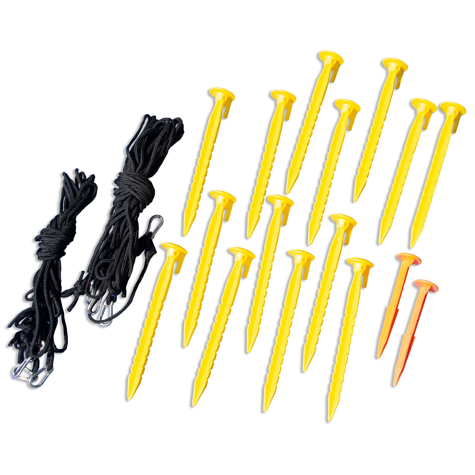 - Contents include 1 projector screen, 1 inflatable frame, 1 inflator pump, 14 tether stakes, 4 long and 4 short tethers, 2 pump stakes, and 1 carrying case