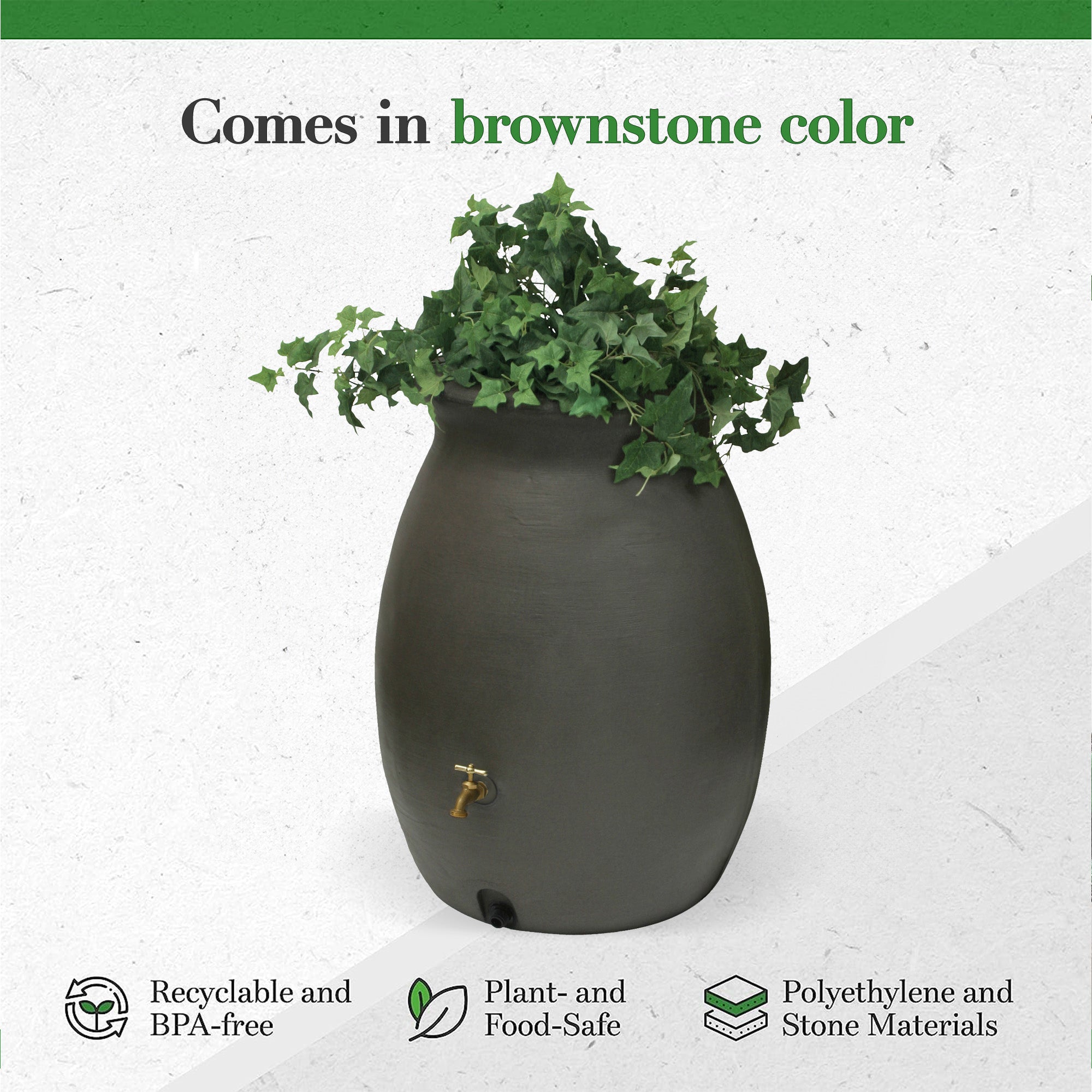 Constructed of durable roto-molded plastic, this 50-gallon rain barrel withstands extreme temperatures and doesn't chip, fade, or crack with time and use. Also built BPA-free and with recyclable materials, the barrel stays healthy and clean. While freshly sitting in your yard, the rain collector doubles as a beautiful decorative planter. The realistic look and rock-like texture of the Brownstone pot offer a genuine, earthy feel.