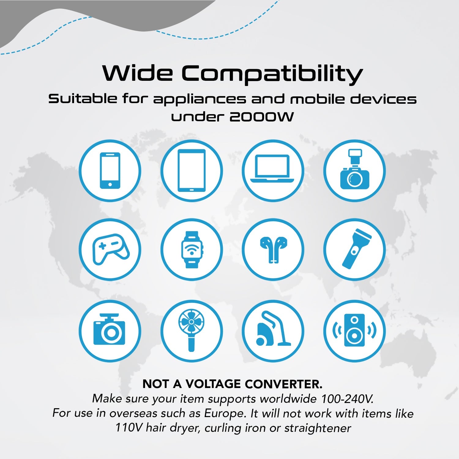 Standard: The Ceptics All-In-One adapter plug is one piece compact unit with sliding mechanism to slide out 4 different types of plug for use in over 200 countries around the globe. The UP-10KU features two USB ports and a Type C USB port to charge your devices such as tablets, phones, smartphones and battery chargers. It also accepts one 2-prong or a 3-prong power cord. Small, simple and packed with everything you may need for your travels!