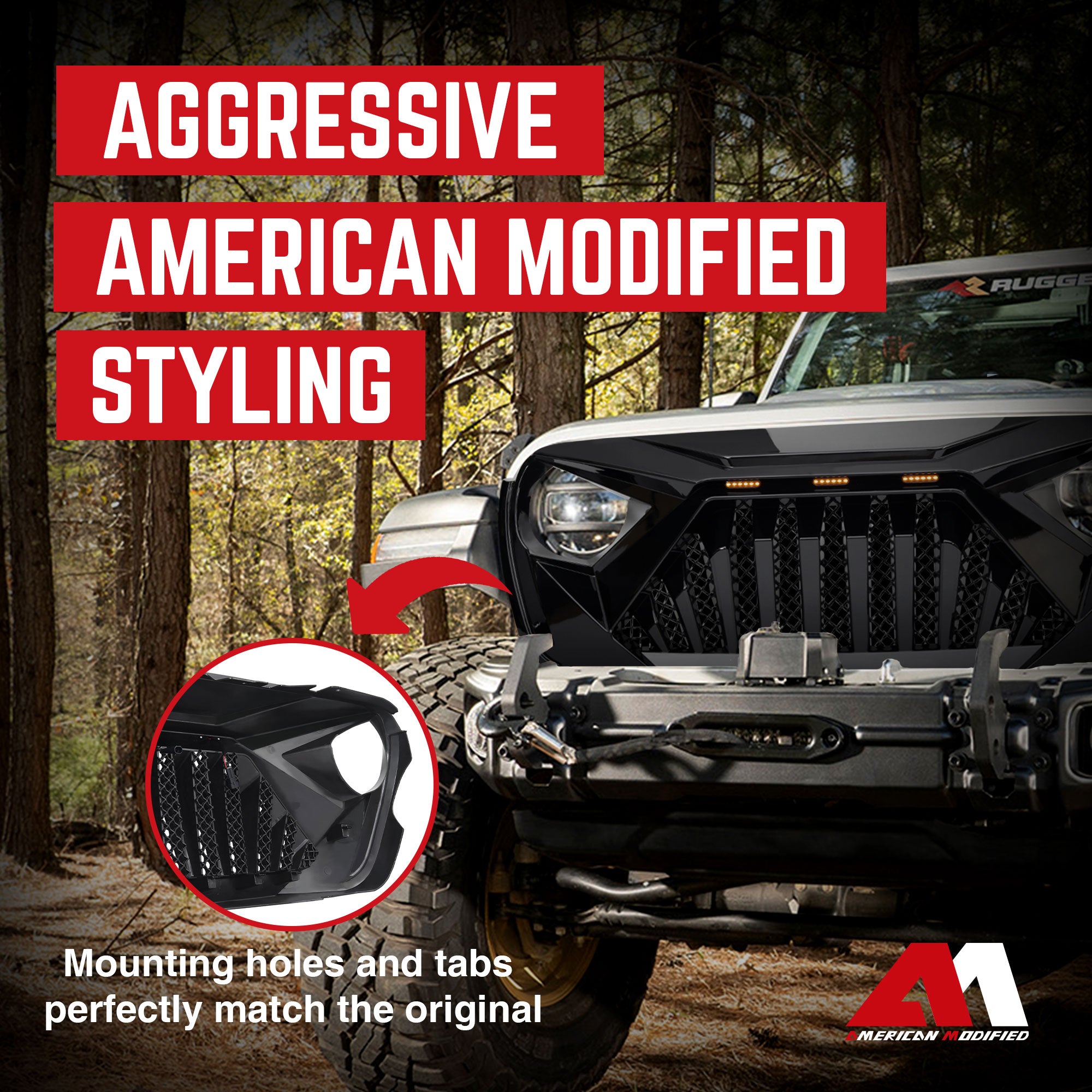 The American Modified Front Goliath Grille makes your vehicle stand out. The aggressive, Goliath-inspired design and durable materials add an aggressive look that can withstand harsh off-road travel hazards. Built to be almost universal, this accessory is compatible with Jeeps from 2018 plus Wrangler JL and 2020 plus Gladiator JT models. Ideal for quick garage work, changing out your old grille for the new one be done in just 15 minutes! Illuminate the night with the innovative 2-light modes, offering versatility for both on and off-road adventures.