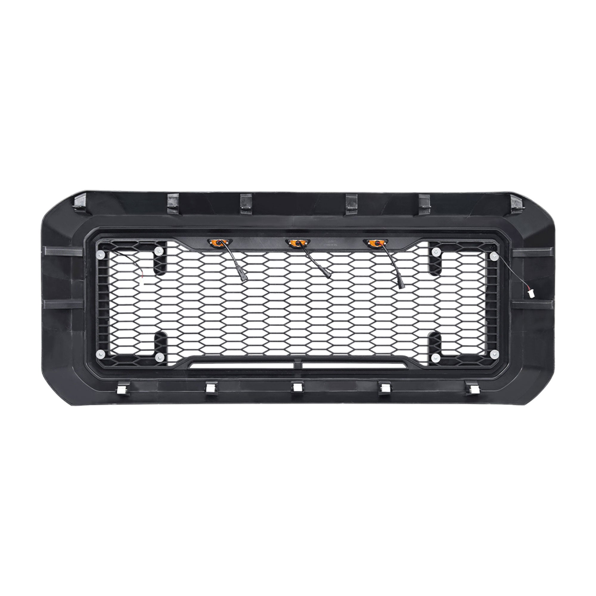 The grille includes 3 amber LED running lights, turn signal lights, and Daytime Running Lights (DRL), adding a distinct, eye-catching element to your truck while improving visibility during nighttime and adverse weather conditions. These LED accent lights come complete with a wiring harness that easily splits into your Ford's existing factory headlight harness, making installation straightforward.