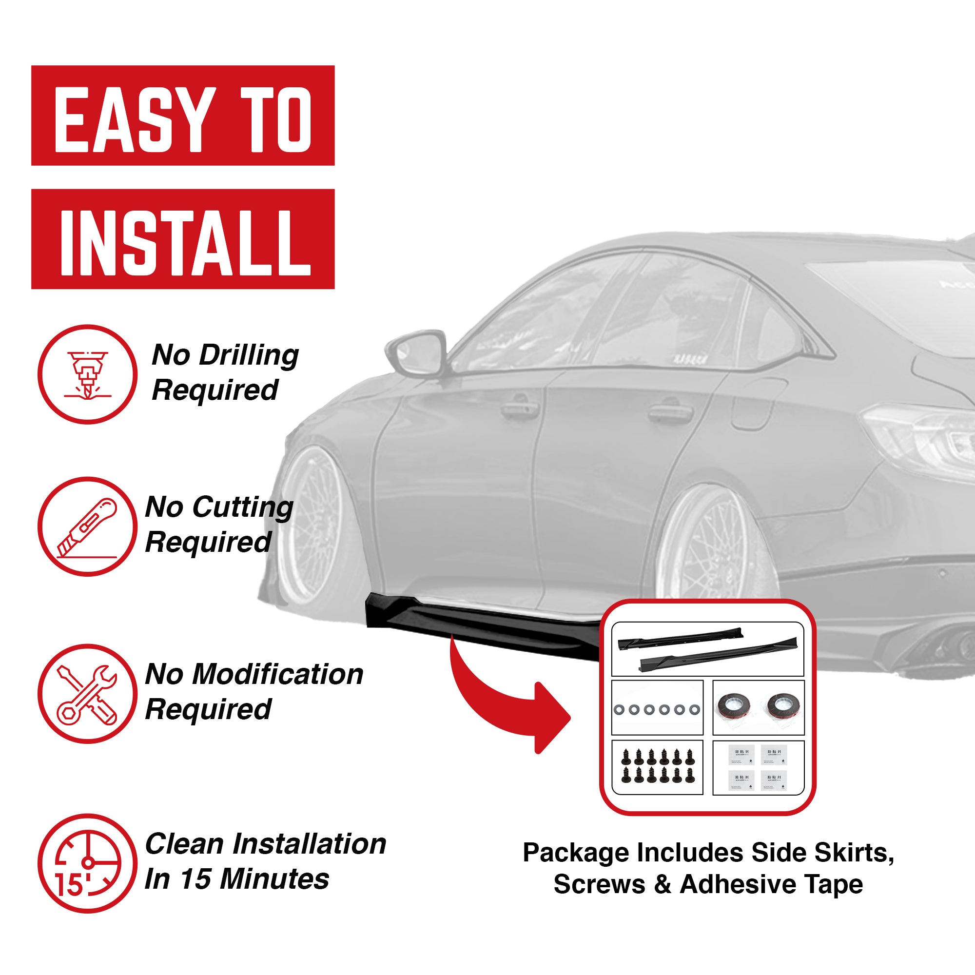 • Side skirts seamlessly integrate with 2018, 2019, 2020, 2021, 2022, and 2023 Honda Accord models, ensuring a precise fit that enhances the overall look of your vehicle