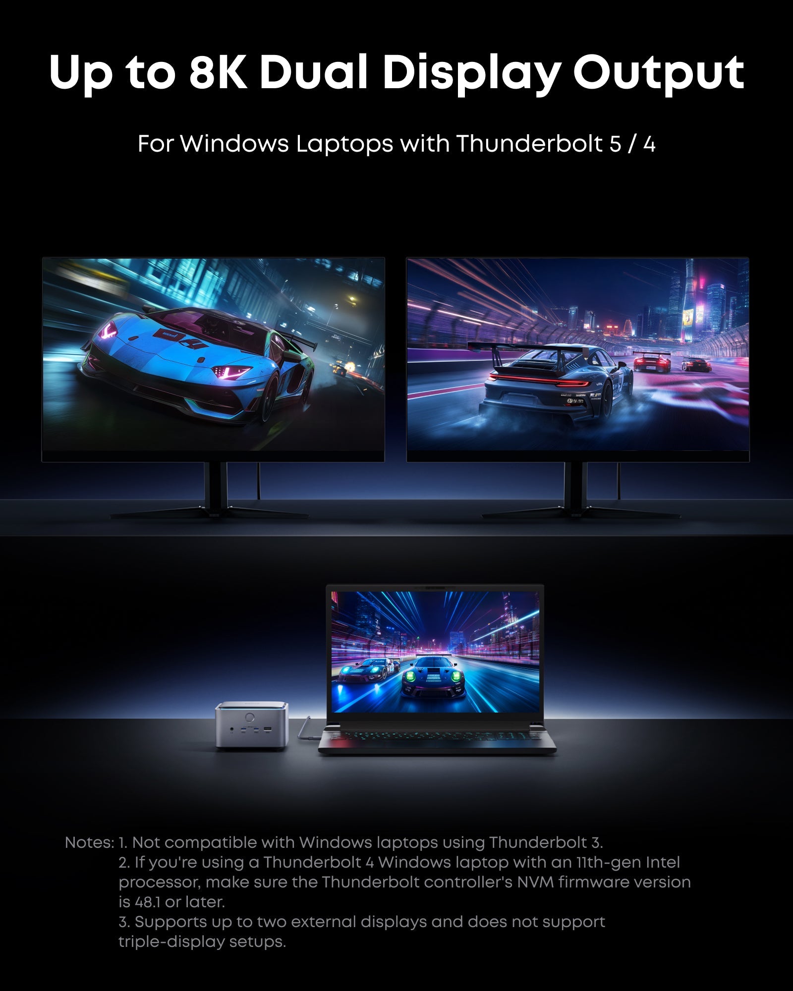 - Dual Display Docking Station: Supports one HDMI or DisplayPort and two Thunderbolt 5 downstream video outputs. Delivers up to 8K@60Hz for a single display, or dual 8K@60Hz for Thunderbolt 5 Windows laptops.
