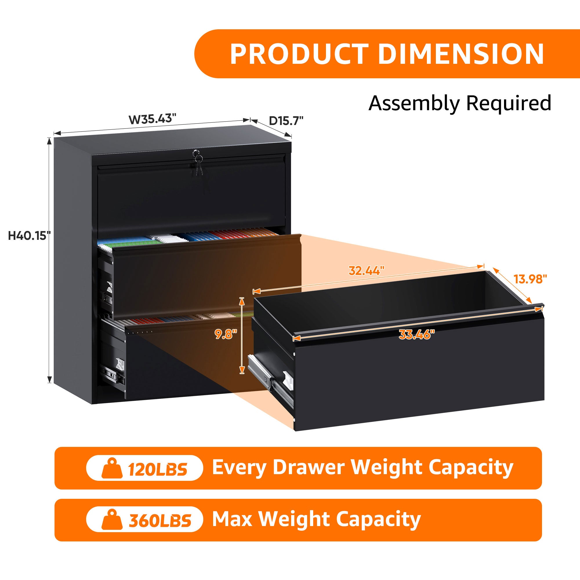 AOBABO 3 Drawer Lateral File Cabinet w/ Lock for Letter/Legal Size Paper, Black