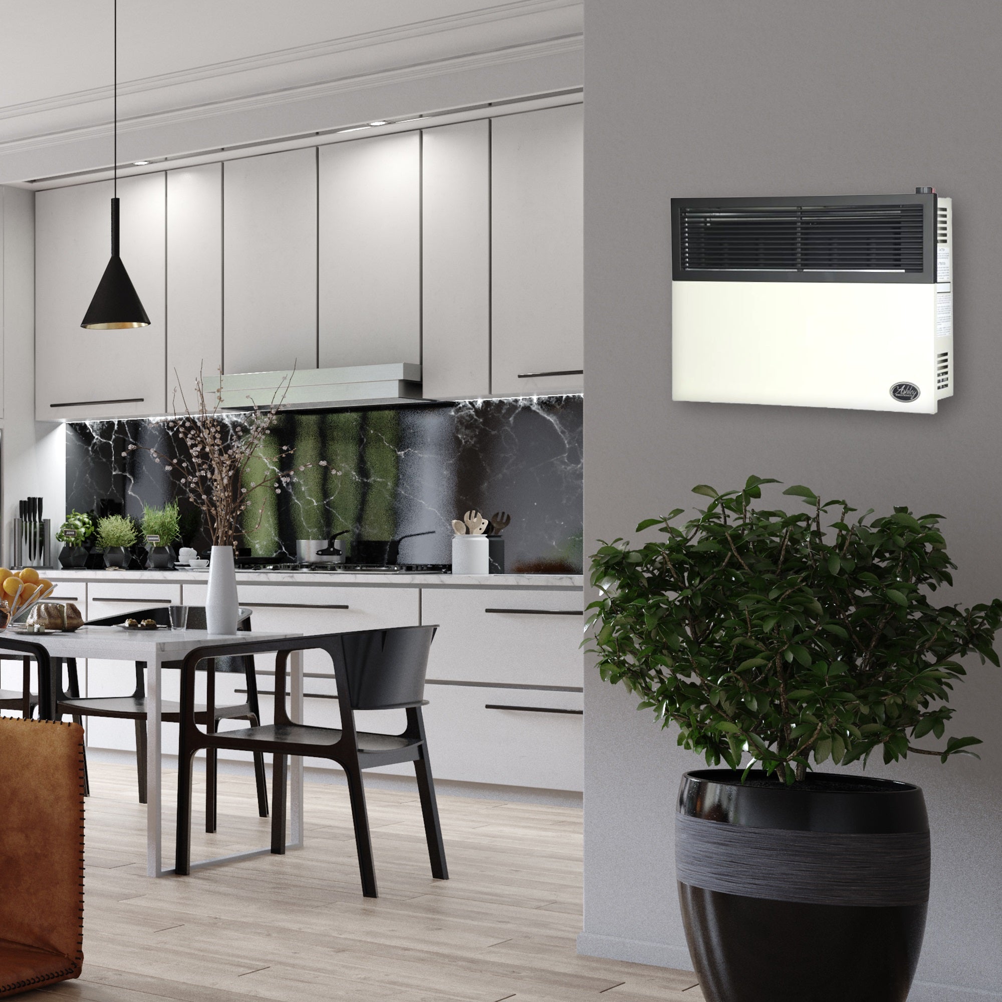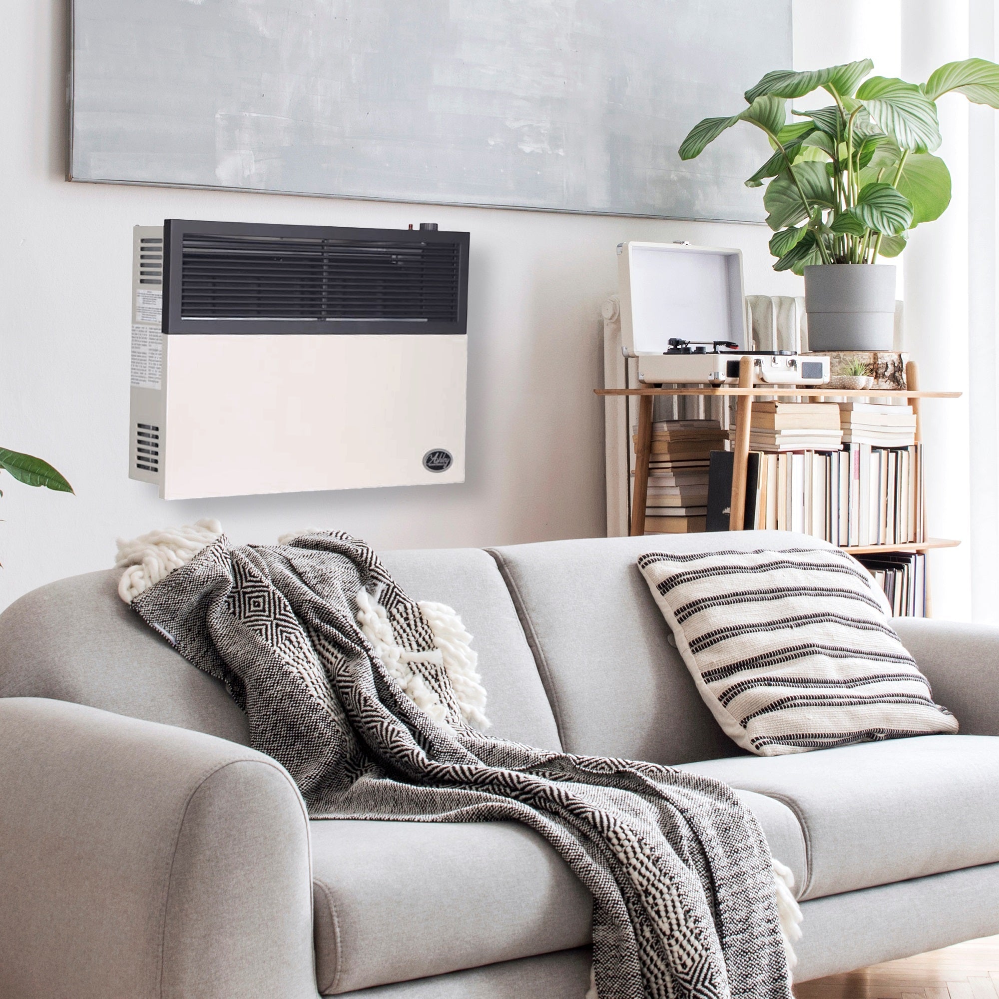 This industry-leading wall furnace keeps your living or workspace warm with a direct vent wall heater that disperses pure, gentle heat, in continuous circulation. The space-saving direct vent furnace design mounts to an exterior wall. When installing wall thickness cannot be less than 4.5 inches and cannot exceed 10.00 inches. The gas flame with matchless Piezo lighting is completely sealed inside, away from all contact with room air.