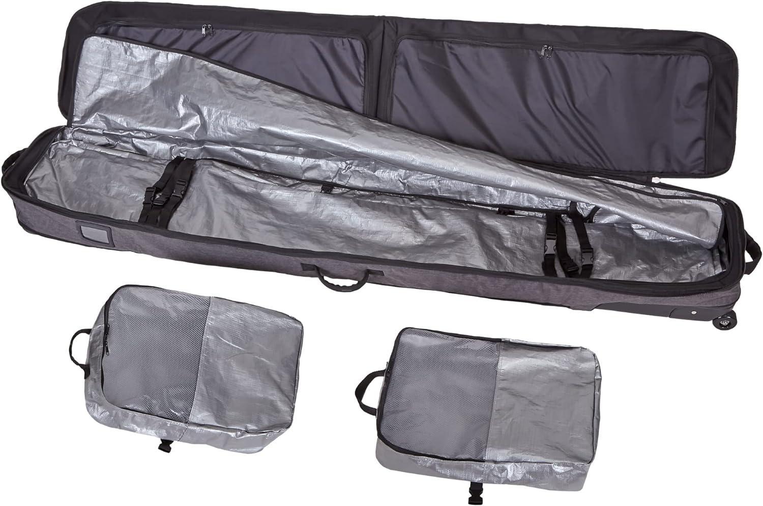 Stow your gear for your next snow adventure in this streamlined winter sports bag. The Athalon Everything Board Bag / Padded - 195 cm is constructed from durable, high density polyester with waterproof backing, a full lining, and a padded interior. Hit the mountain with this functional bag that is roomy enough to hold two sets of skis and one snowboard or three sets of skis. This convenient wheeled bag has a comfort grip handle for easy carrying, self-healing nylon zippers for security, and locking zipper pulls so you can travel securely knowing your important gear is safe inside.