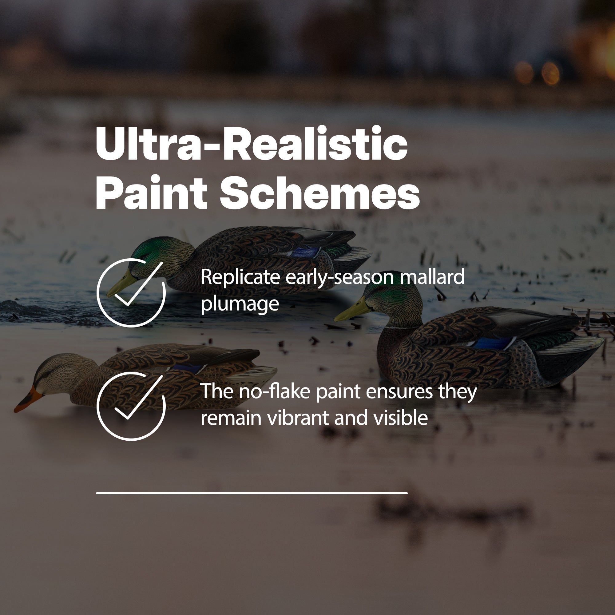 - Decoys with ultra-realistic paint schemes replicate early-season mallard plumage, attracting even the wariest ducks and ensuring your hunting spread looks as natural as possible