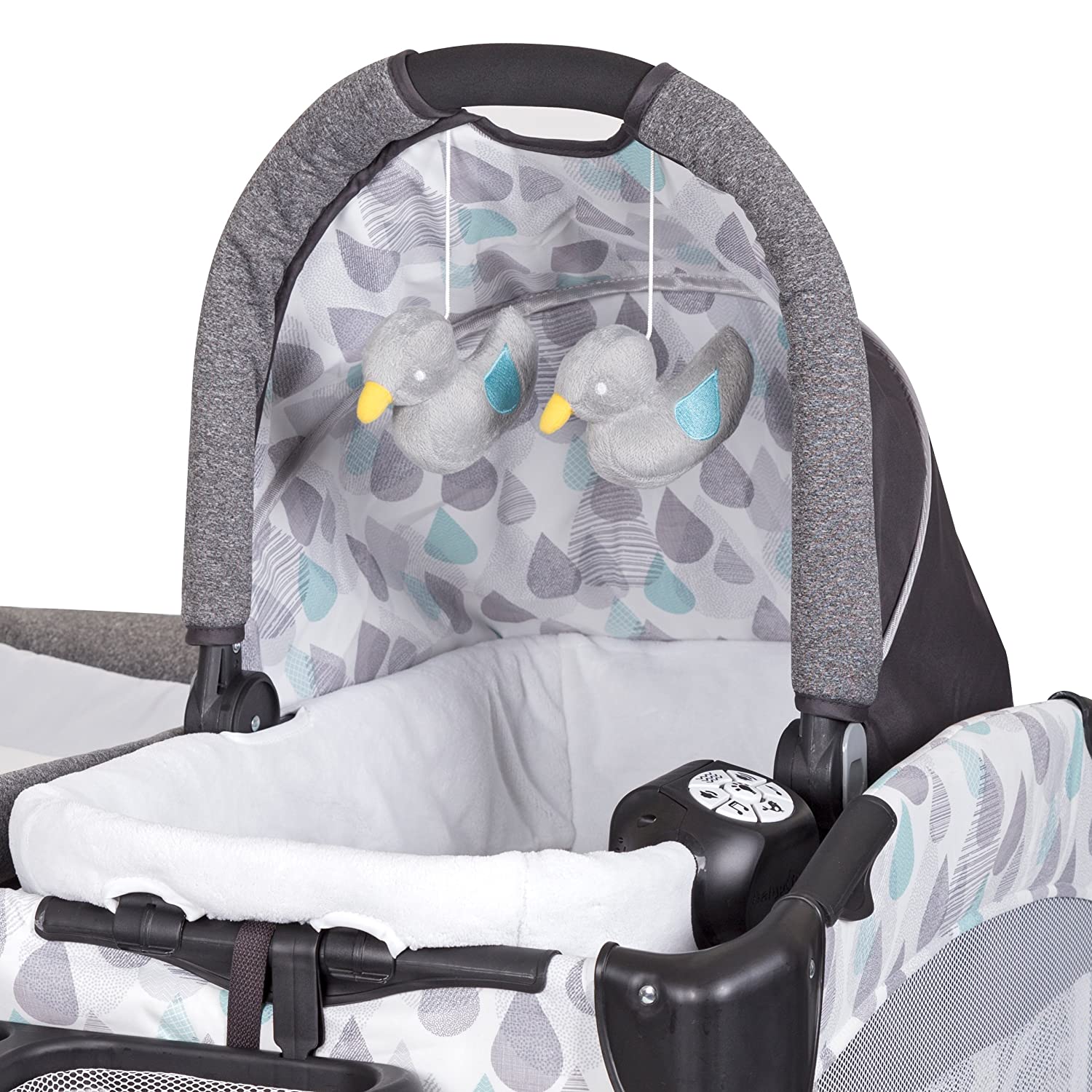 • Includes removable full-sized bassinet/rocker, multi-textured mattress pad, diaper changer with parent organizer, spacious play yard, and travel/storage tote bag