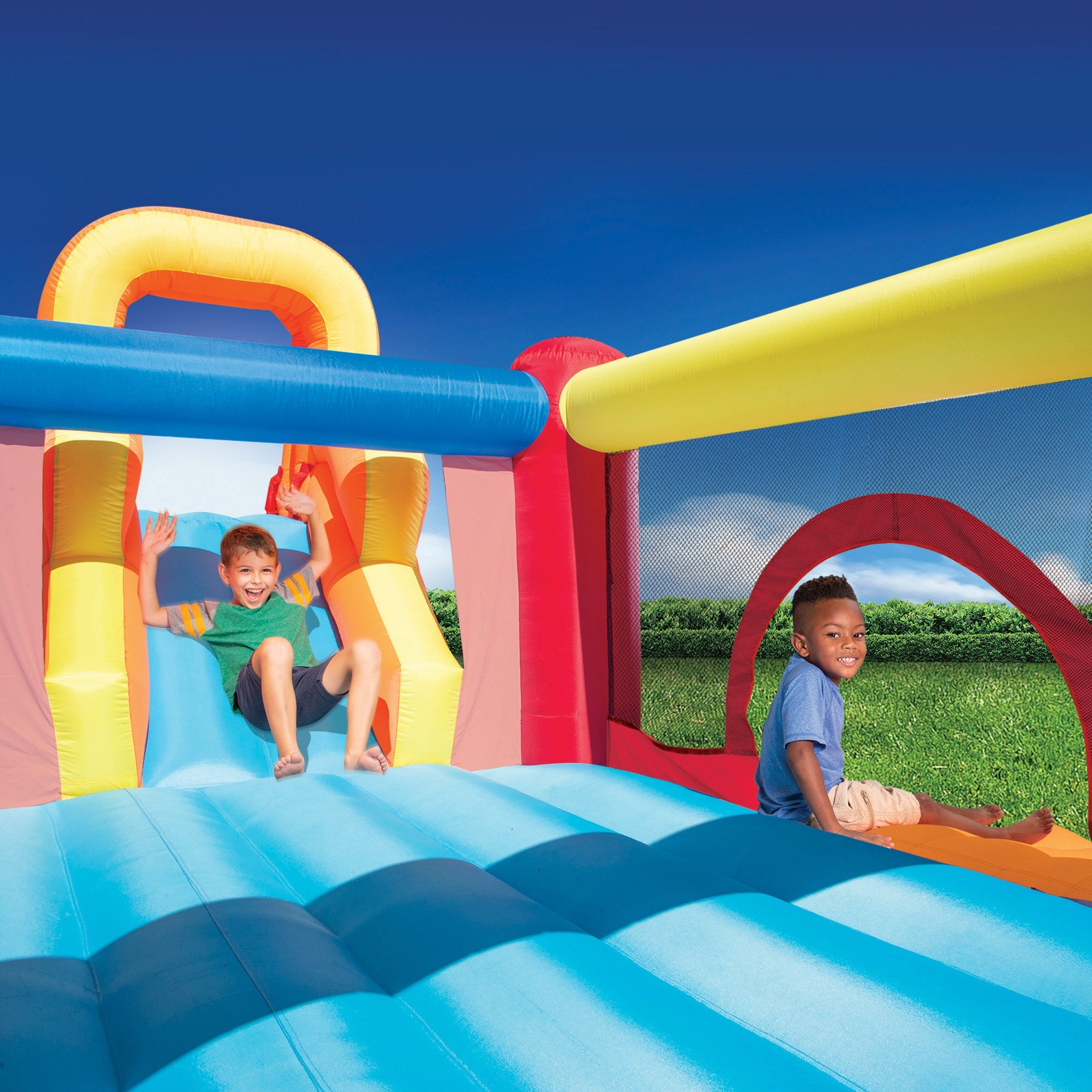 Slide in and out of backyard bouncing fun with the Double Slide Bouncer by Banzai.