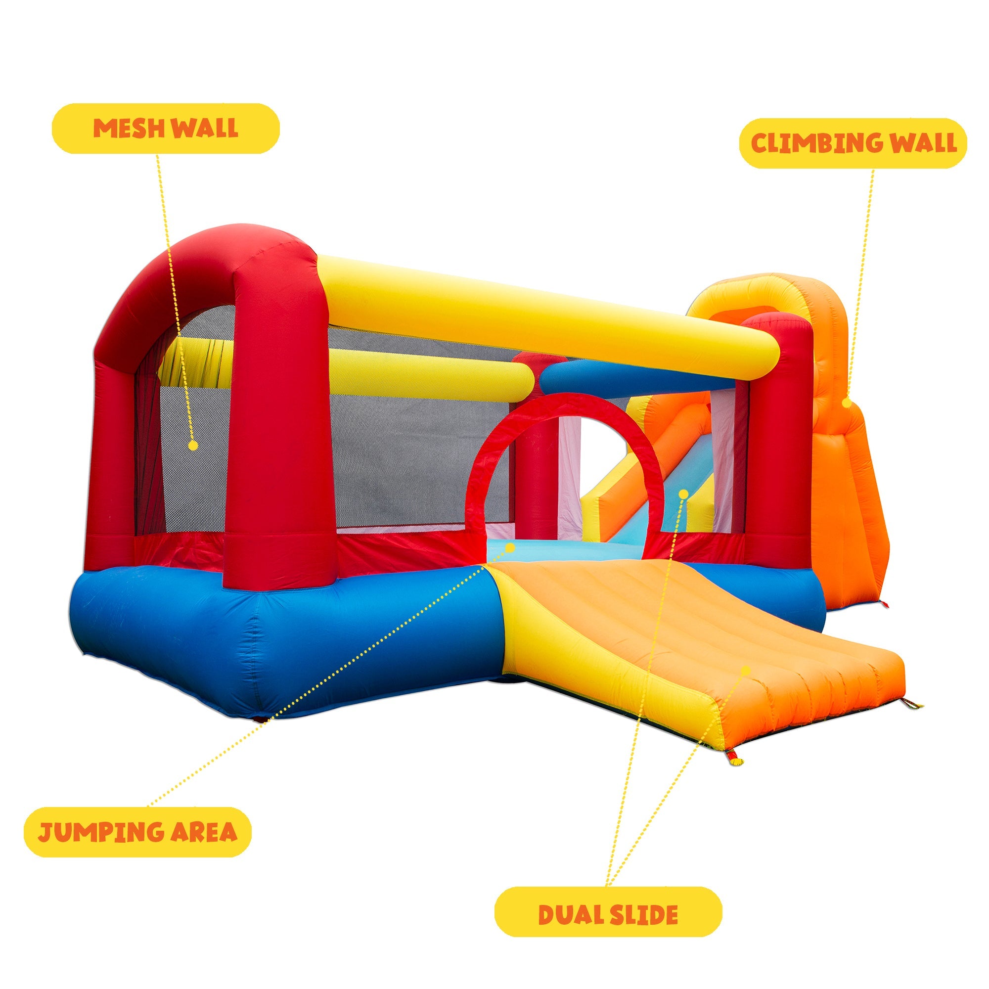 • Climbing wall connects to a slide which send kids into the bouncer play area