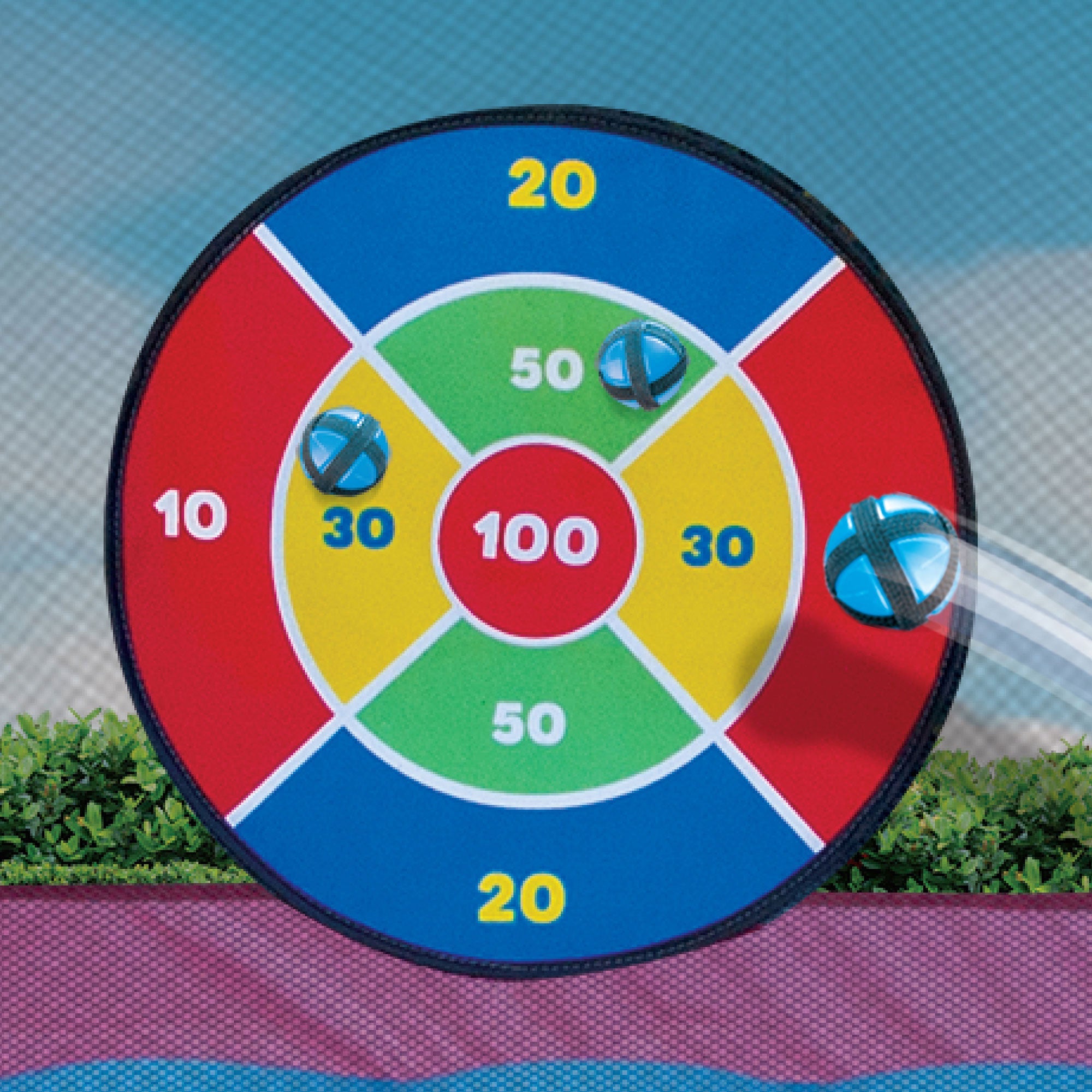 • Lots of fun and games with included inflatable soccer ball, built-in soccer net, dart board, and 3 self-sticking toss balls