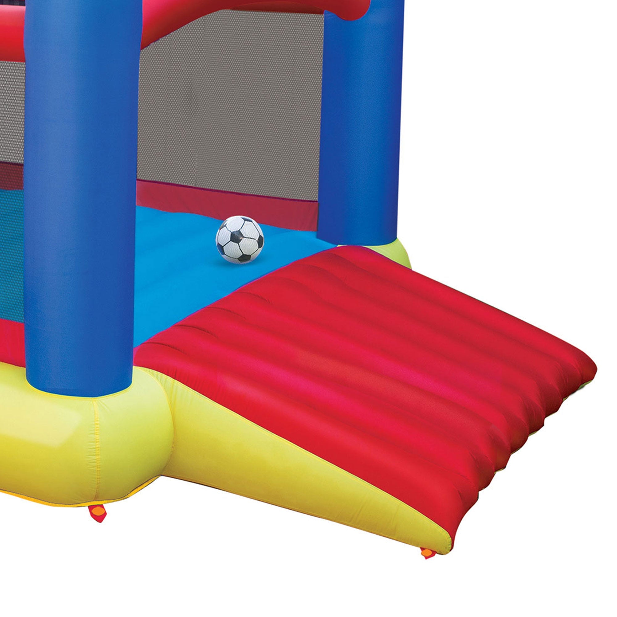 Little ones can jump and tumble in the roomy bouncing area, kick or toss the soccer ball into the goal, or practice their aim with the dart board and target balls outside the walls. This large, over-sized bouncer measures 12 feet long, 9 feet wide, and 7 feet tall, with a 7- by 7-foot bouncing area. Kids can invent their own games with all the included toys. This backyard inflatable bounce house comes with an inflatable soccer ball, built-in soccer net, dart board, and 3 self-sticking toss balls. With a wide slide for entry and exit, this outdoor bouncer bounce house is great for ages 3 and up.