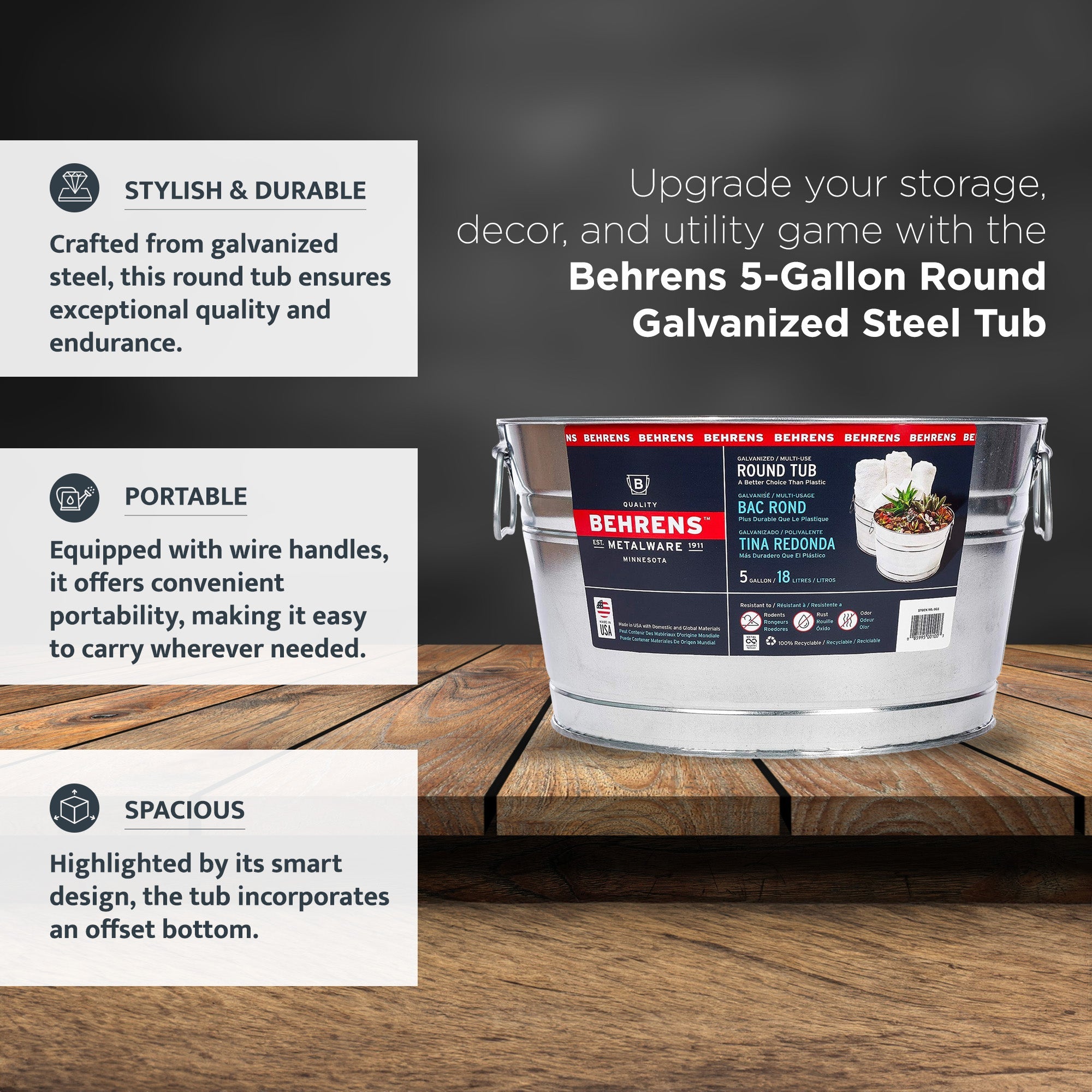- Elevate your storage, decor, and functionality with this 5-gallon round galvanized steel tub, an adaptable and sturdy solution for various needs