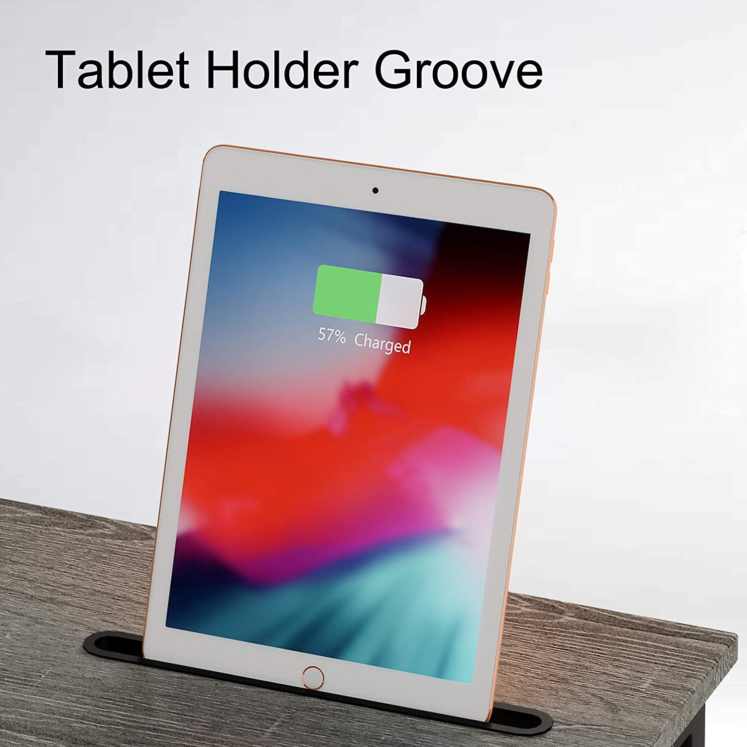 This work desk includes a storage bag that attaches to the side of the desk for ease of storage and simplicity. Boosting function and design, an 8.8 inch built-in tablet stand keeps your mobile device nearby and on display. A headphone hook is attached to the side of the desk to keep your headphones within reach while saving surface space. You can use the under-desk storage shelf to keep study materials, books, and important documents easily accessible but out of sight.