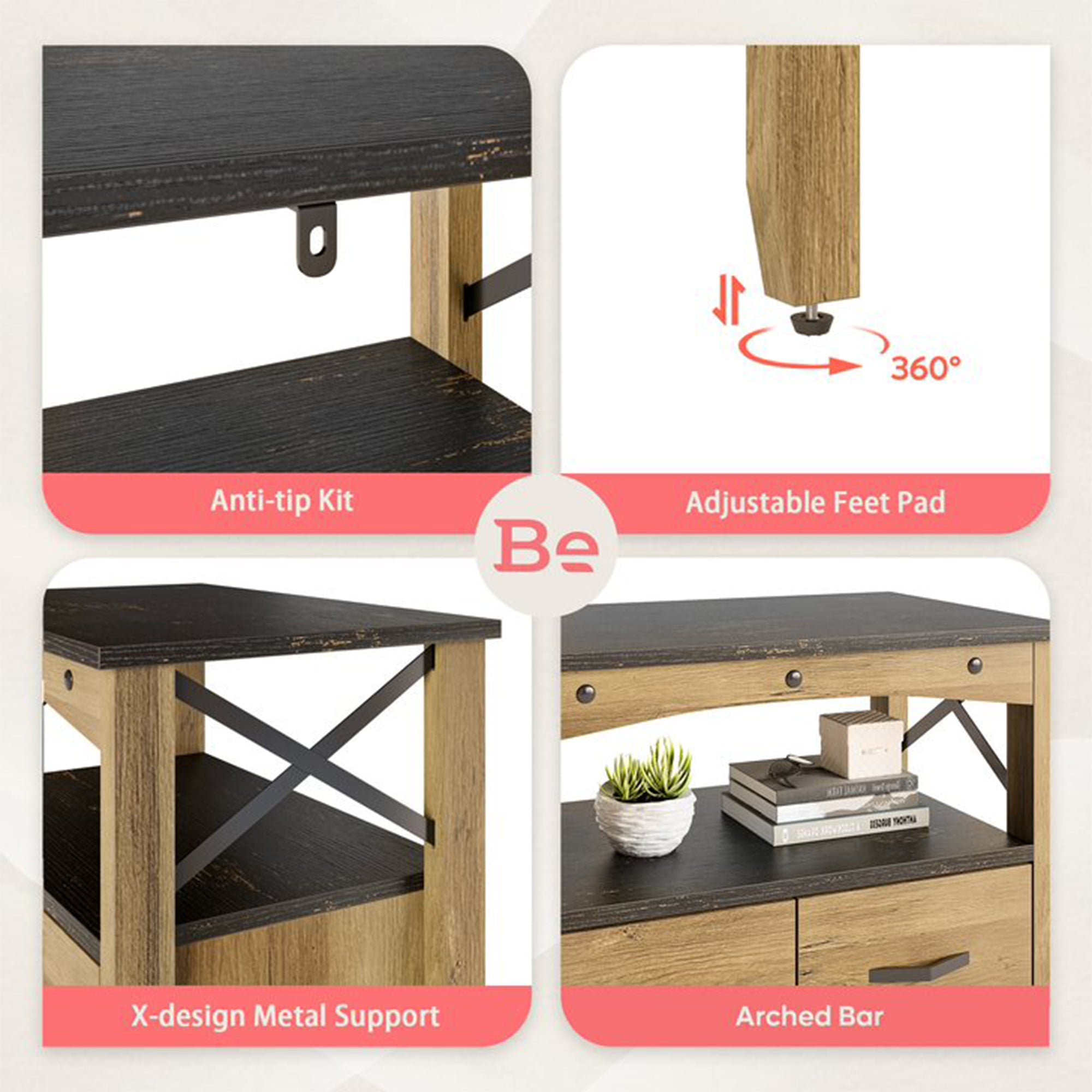 Constructed of furniture-grade P2 board, this storage unit features an anti-tip kit to anchor your furniture to the wall and an X-design metal support, made with sturdiness and safety in mind. Adjustable foot pads allow stability on mildly uneven surfaces without the need to purchase shims or levelers. Unique and multifunctional, this cabinet will make a welcome addition to your living room, hallway, bedroom, or office.
