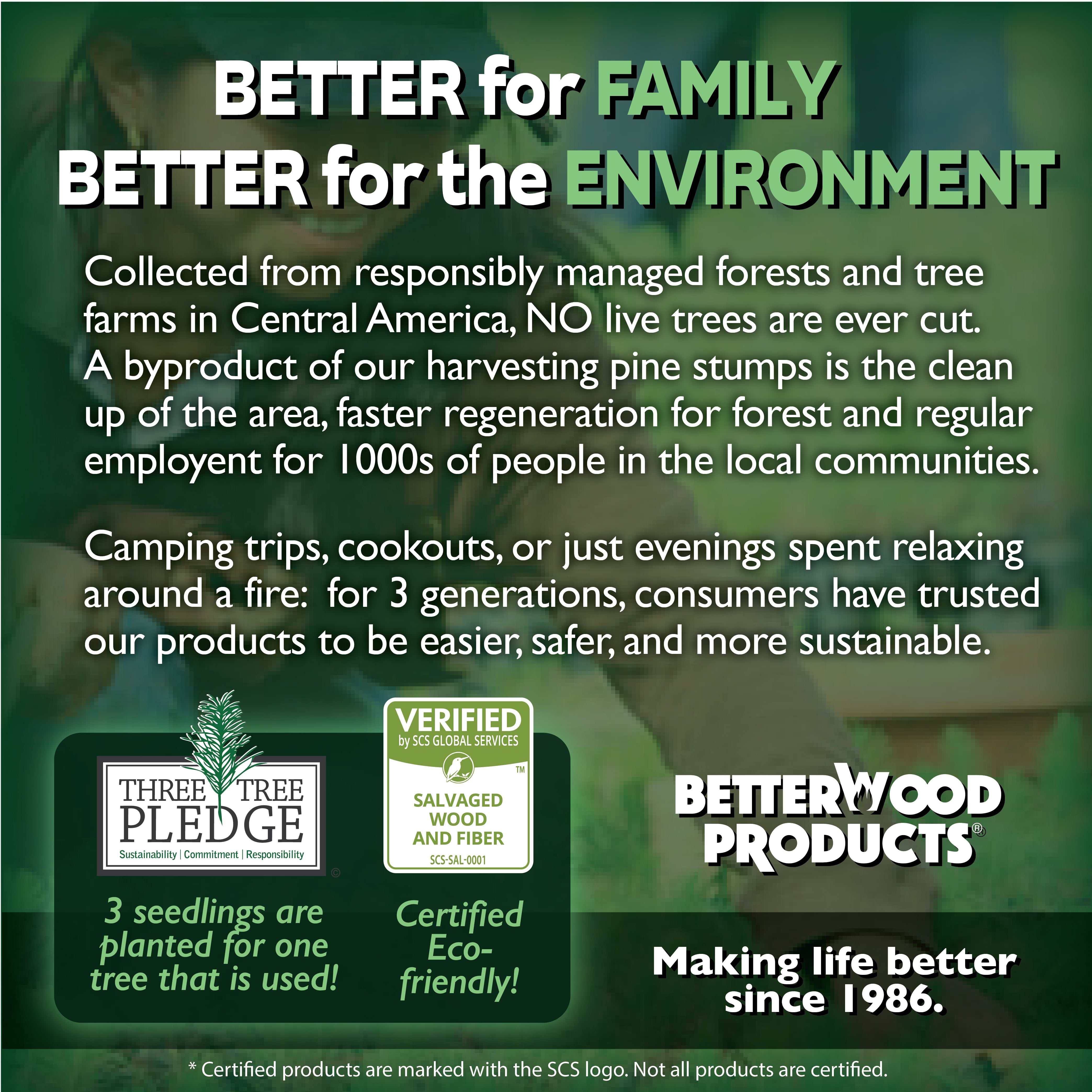 Fatwood fire starter sticks are 100-percent natural, made from resin found in the stumps of pine trees with no chemicals, or additives, providing a safer, simpler way to start any fire. These fire sticks start fast and burn hot, even when wet. Ideal for fireplaces, chimeneas, pellet stoves, and more, you can take this firewood wherever you go. Sustainability is of utmost importance, and the Three-Tree Pledge created by Better Wood Products plants 3 trees for every 1 that is harvested.