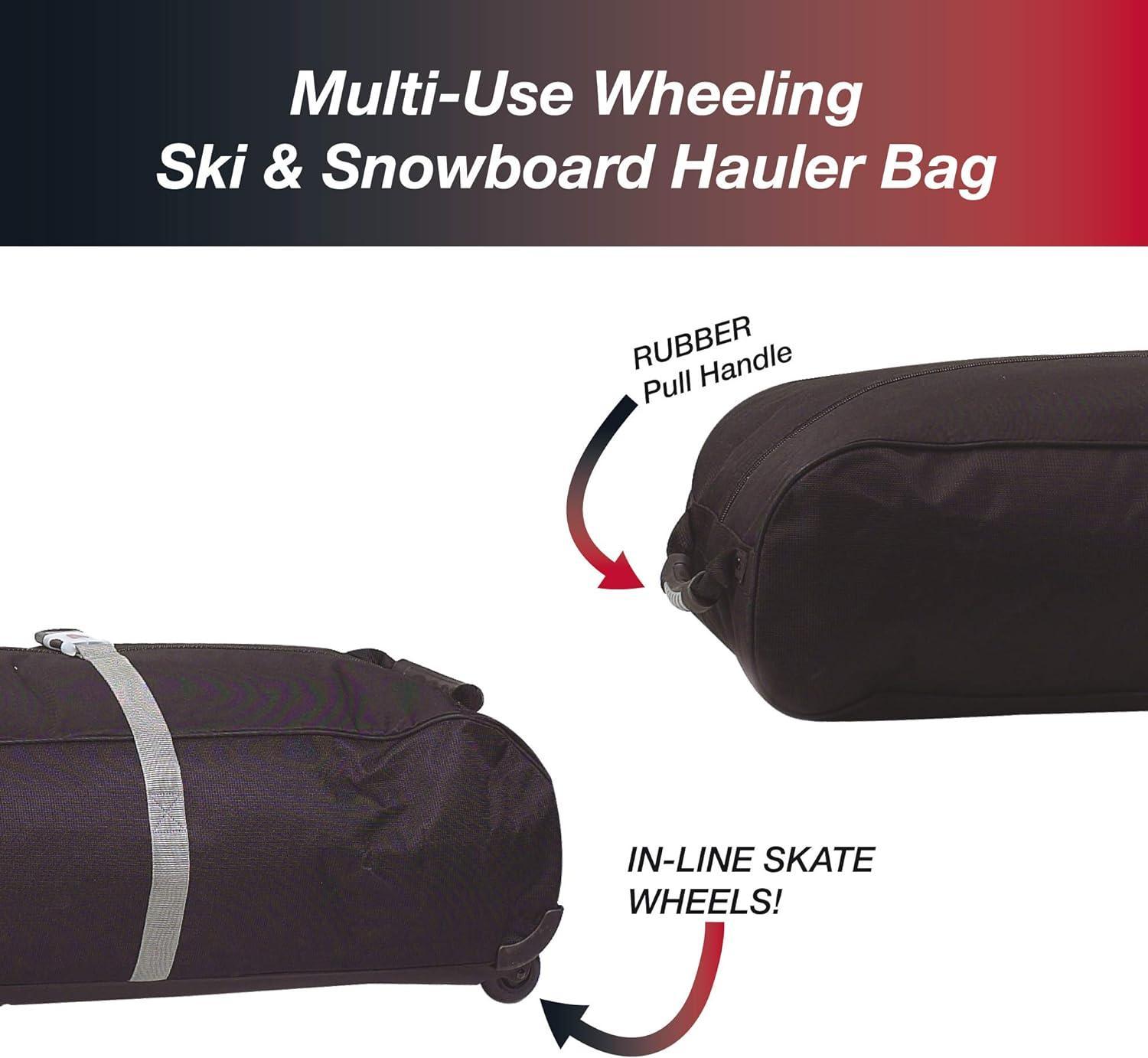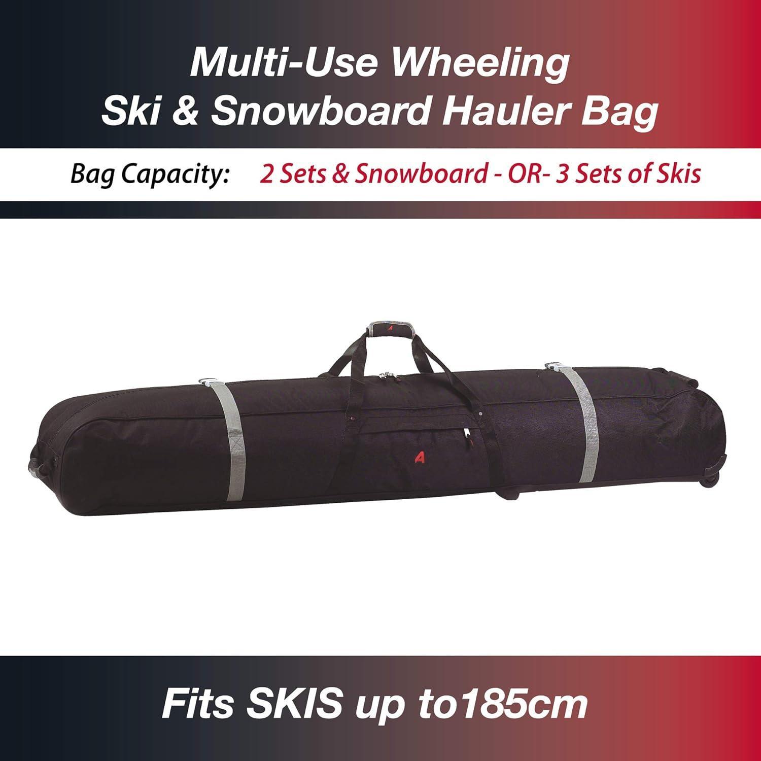 Stow your gear for your next snow adventure in this streamlined winter sports bag. The Athalon Multi Use Wheeling Ski/Snowboard Bag Padded - 185 cm is constructed from durable, high-density polyester with waterproof backing, a full lining, and a padded interior. Hit the mountain with this functional bag that is roomy enough to hold two sets of skis and one snowboard or three sets of skis. This convenient wheeled bag has a comfort grip handle for easy carrying, self-healing nylon zippers for security, and locking zipper pulls so you can travel securely knowing your important gear is safe inside.