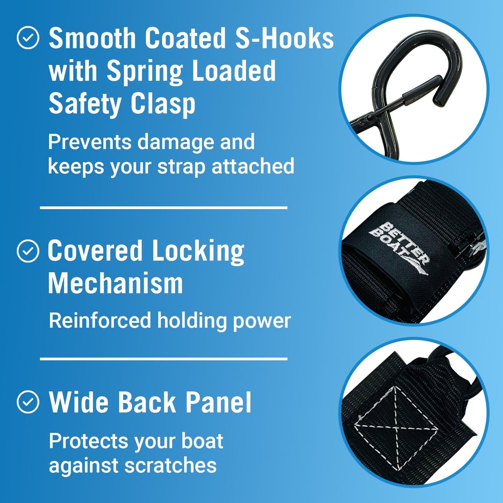 - SECURE & GENTLE: Prevent damage to your watercraft by reducing movement during transit. Our stainless buckle is backed by an oversized 3” protective nylon shield, each hook is PVC coated, and a secure strap holds the clasp locked without a ratchet.