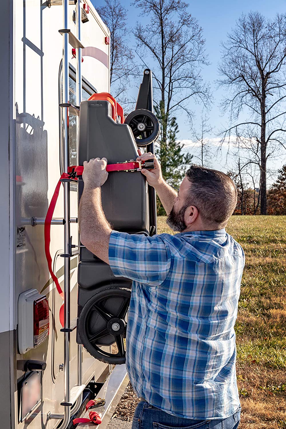 Constructed of durable blow-molded, UV stabilized HDPE that won’t leak or deteriorate in the sun. With zinc-plated hardware, rust and corrosion are prevented. The inside of the tote tank is smooth so that it doesn’t trap odors or debris, and is sloped toward the drain hole, making it easy to empty. The handle is oversized and durable, allowing you to pull or tow the tote tank without worry. The bottom of the tote tank features an integrated ladder hook, allowing you to hang the tank on your RV’s ladder when it is empty, and tie-down grooves to hold it in place with straps. This ready-to-use kit includes everything needed to transport waste from your RV or trailer to a dump station.