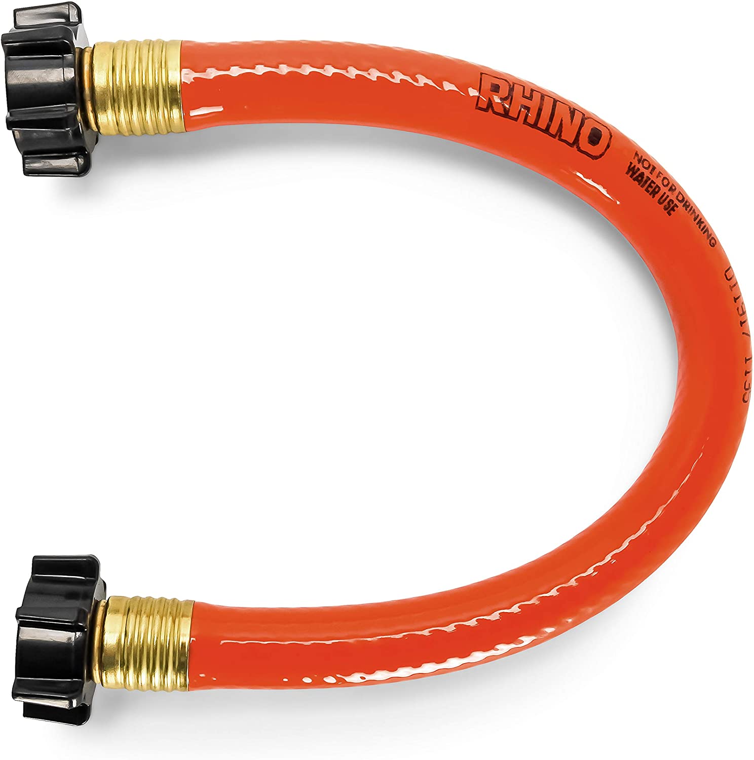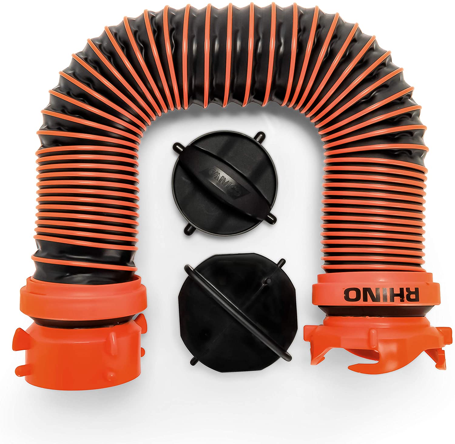 - Includes: 3-foot RhinoEXTREME sewer hose with bayonet and lug fittings, 15-inch water hose rinse adapter, clear elbow with 4-in-1 adapter, clear double bayonet elbow, 3 storage caps, 2 caps with lanyards for rinse connections, and 24-inch tow bar