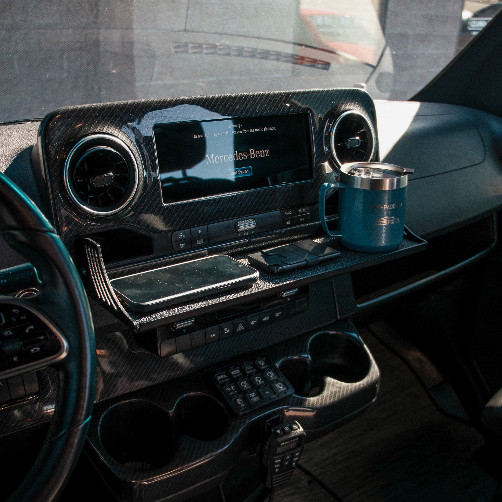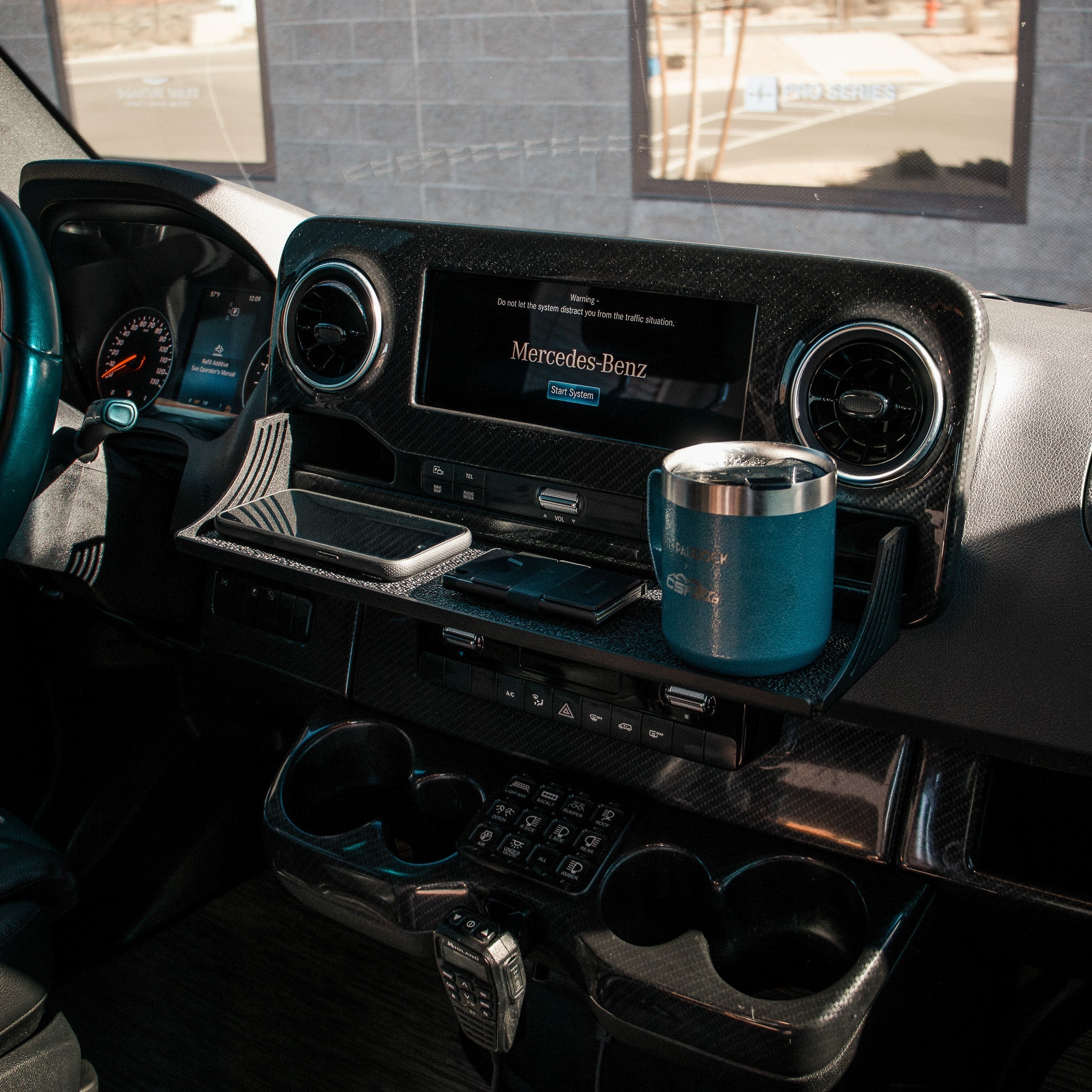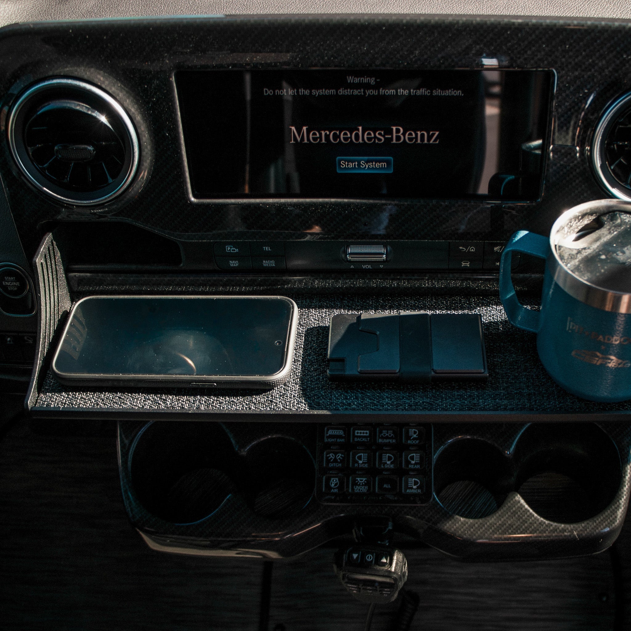 A compact aluminum tray that mounts below the screen on your Mercedes Sprinter dash. Keeps phones, wallets, keys and earbuds within easy reach. Easy, tool-free installation, it simply slides into place.