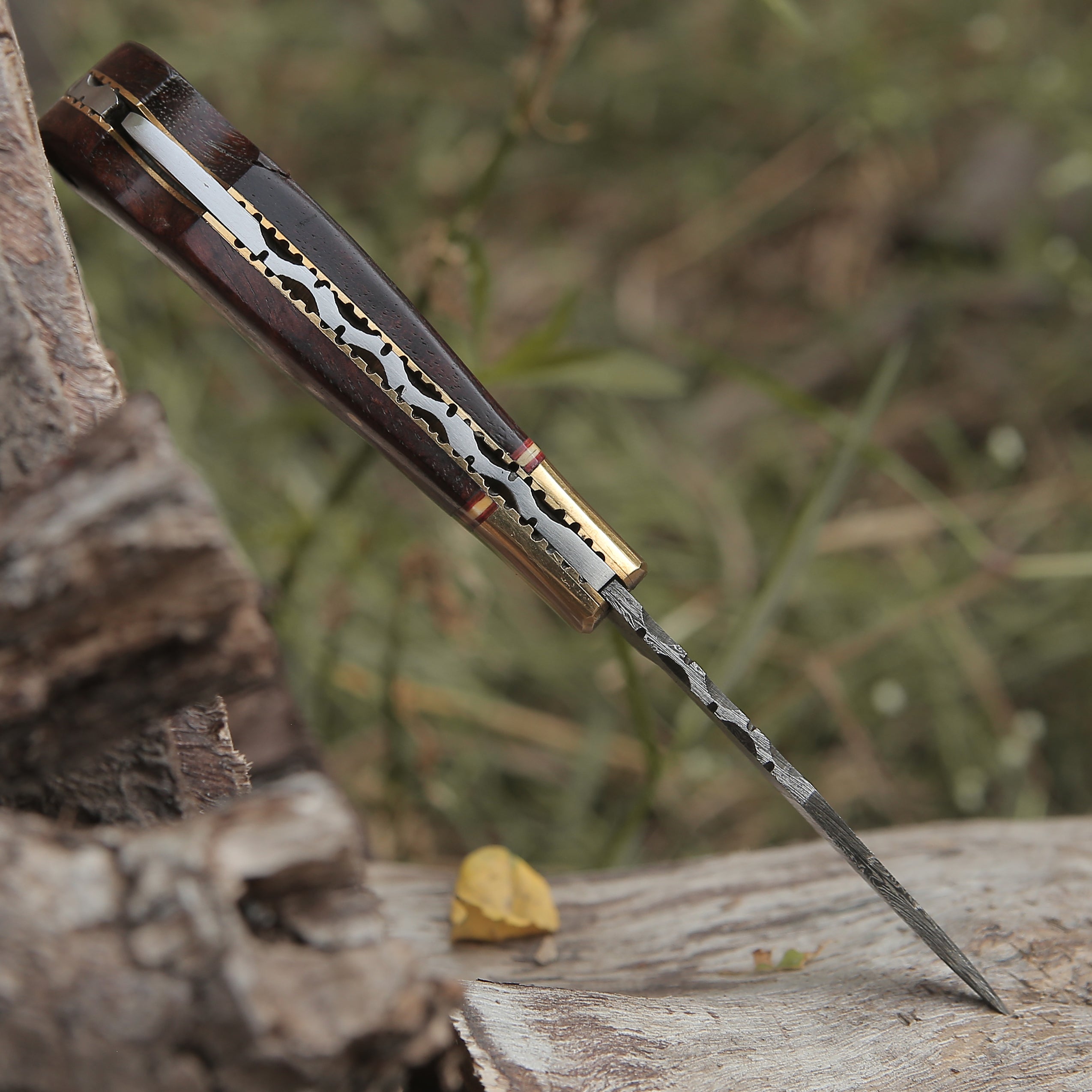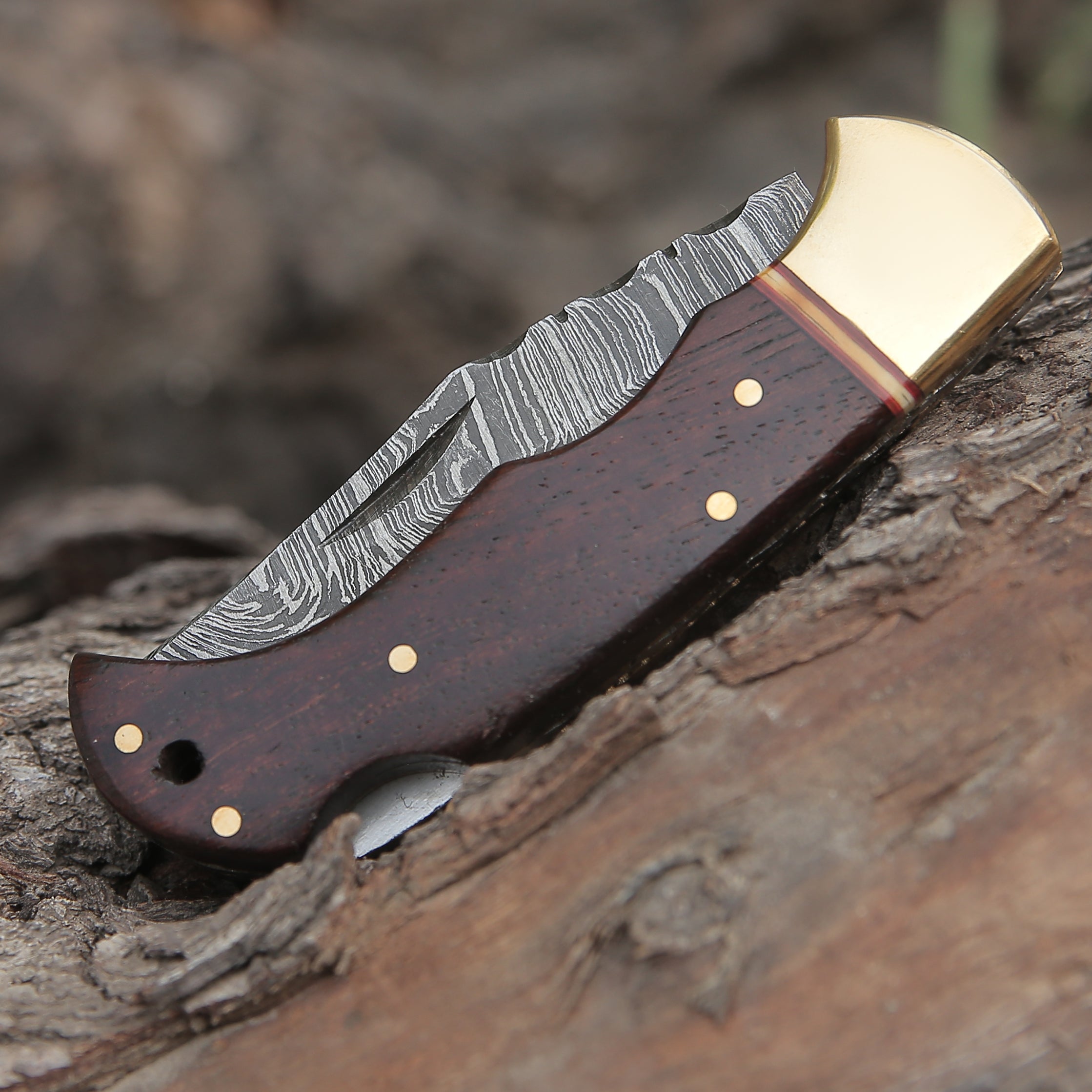 Custom Hand Forged Damascus Folding Knife Brass Bolster With Rose Wood Handle WH 1555