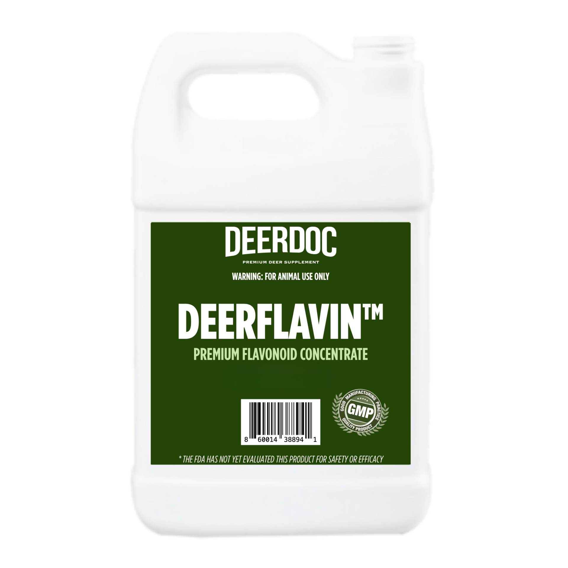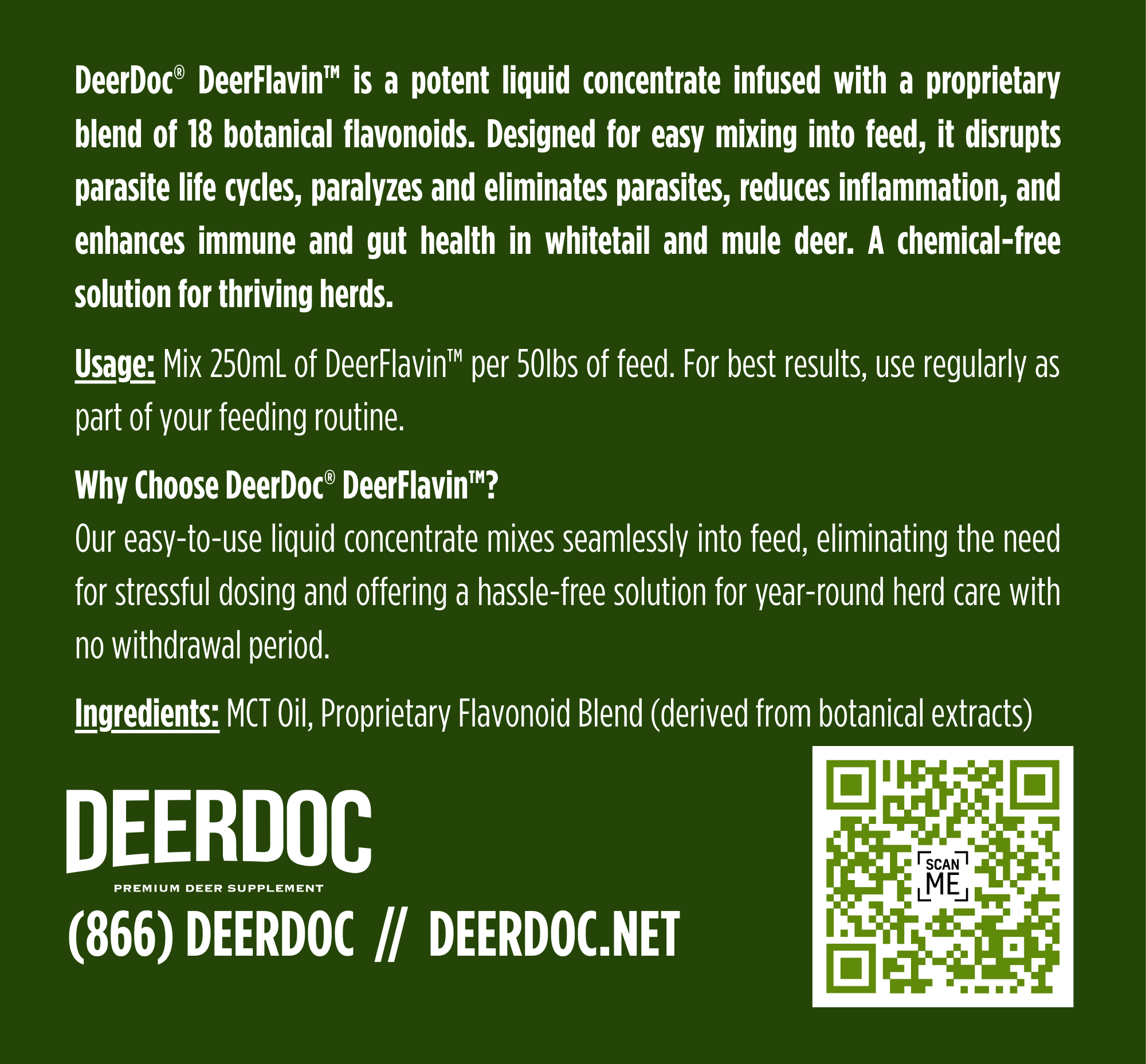 DeerDoc® DeerFlavin™ is your ultimate natural ally in deer health—a potent liquid concentrate infused with our proprietary blend of 18 botanical flavonoids, designed to paralyze parasites, neutralize eggs, reduce inflammation, and supercharge gut and immune function without any harsh chemicals. This versatile formula coats your deer's feed evenly for maximum absorption and convenience, delivering antimicrobial protection and vitality to whitetail and mule deer herds year-round.