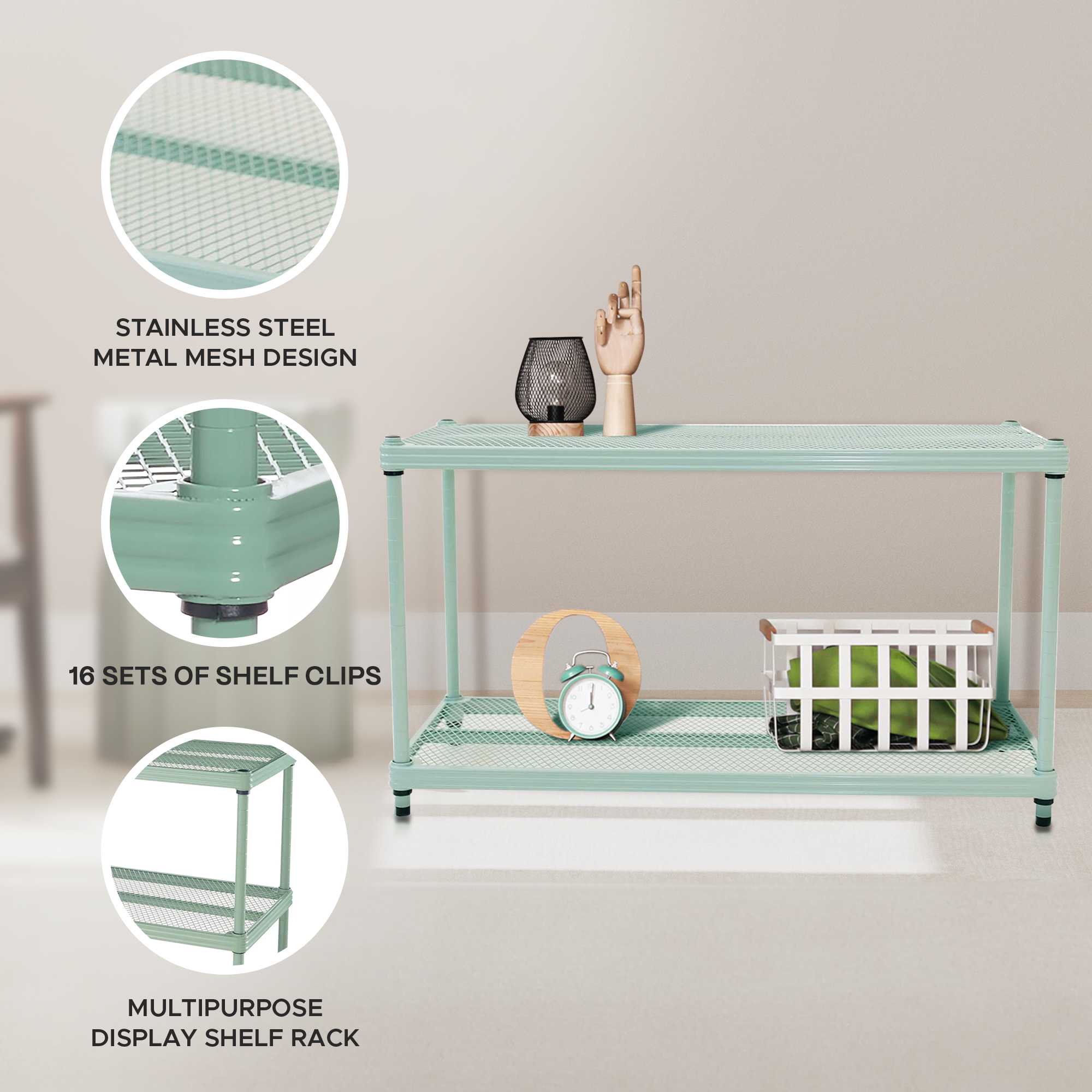 - Expanded metal mesh shelving design means this multipurpose display shelf rack will not let bottles, cans, or other small items fall through