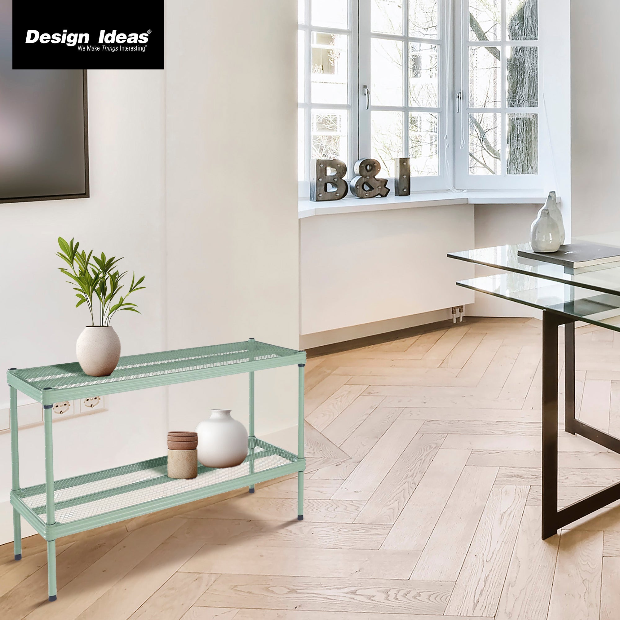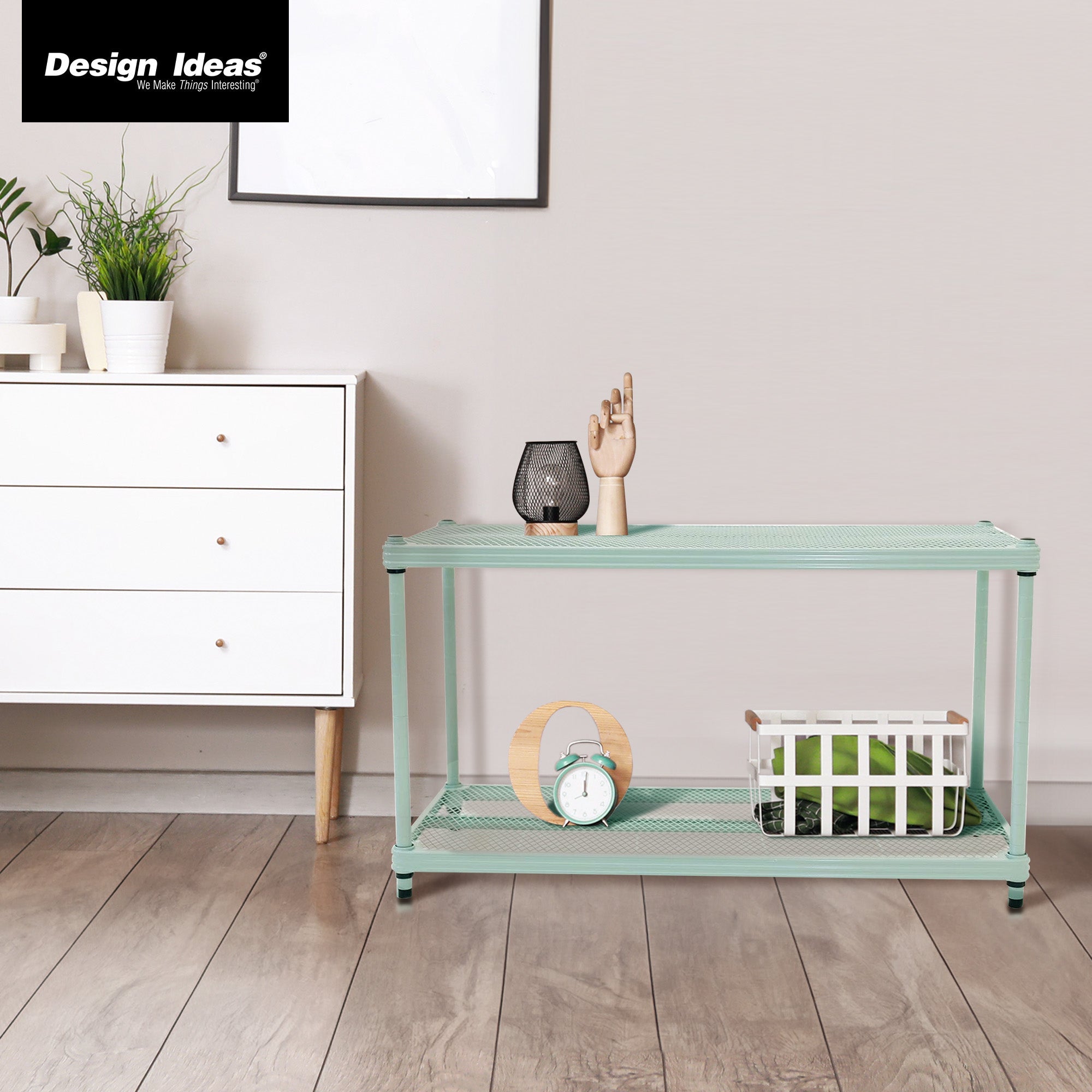 Great for apartments, storage units, basements, living rooms, and more, you can get the most out of your storage space with the Design Ideas MeshWorks 2-Tier Shelving Unit.