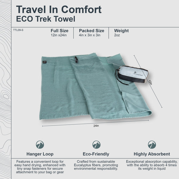 Produced in a closed-loop Lyocell® production circle, our Trek Towel saves water and minimizes chemical usage, offering an eco-conscious alternative to traditional cotton towels. Compared to cotton, our Lyocell® Trek Towels consume significantly less water during production, making them a sustainable choice for environmentally conscious travelers. Packed in a multipurpose stuff sack made of 100% recycled nylon, our Trek Towel is highly absorbent, quick-drying, and sand and pet hair resistant. Plus, it features a convenient loop for hang drying with tiny snap fasteners, ensuring hassle-free drying on the go. Available in four sizes and two beautiful colors, it's the perfect blend of sustainability and style for your adventures.