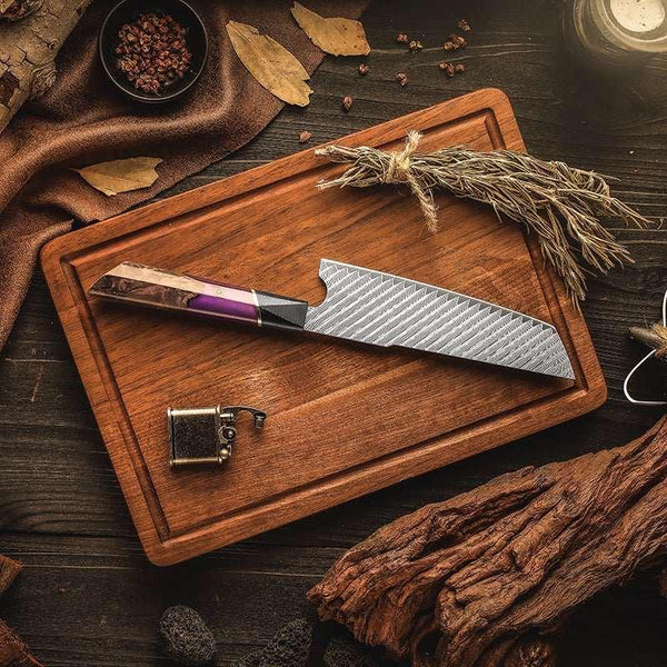 VG10 Damascus steel, renowned for its robustness, is a premium choice in knife making. It serves as the core in Damascus blades, typically layered with other stainless steels for enhanced aesthetics and performance. This steel is specially treated, oil quenched at 2100°F, and rapidly cooled twice to achieve a hardness of 58 or higher on the Rockwell scale. This process not only improves strength and edge retention but also creates the distinctive patterns that make Damascus knives highly prized by chefs and collectors alike.
