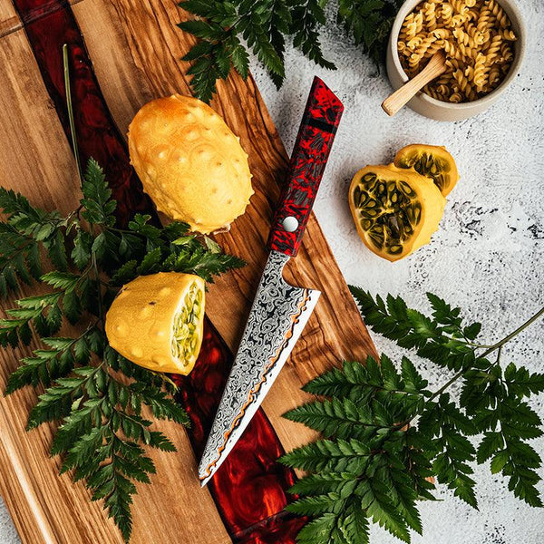 Epical Japanese Chef Knife Copper Damascus Steel Blade with Carbon Fiber Handle and Sheath